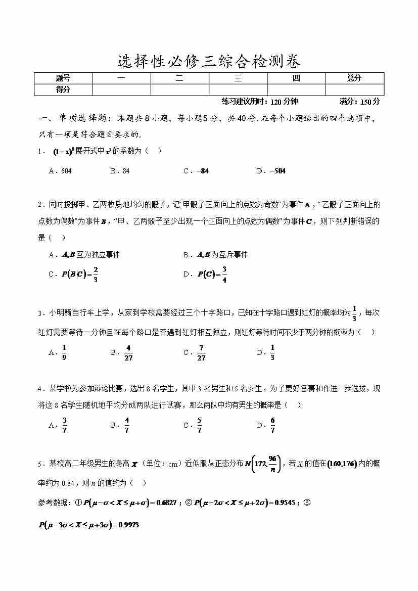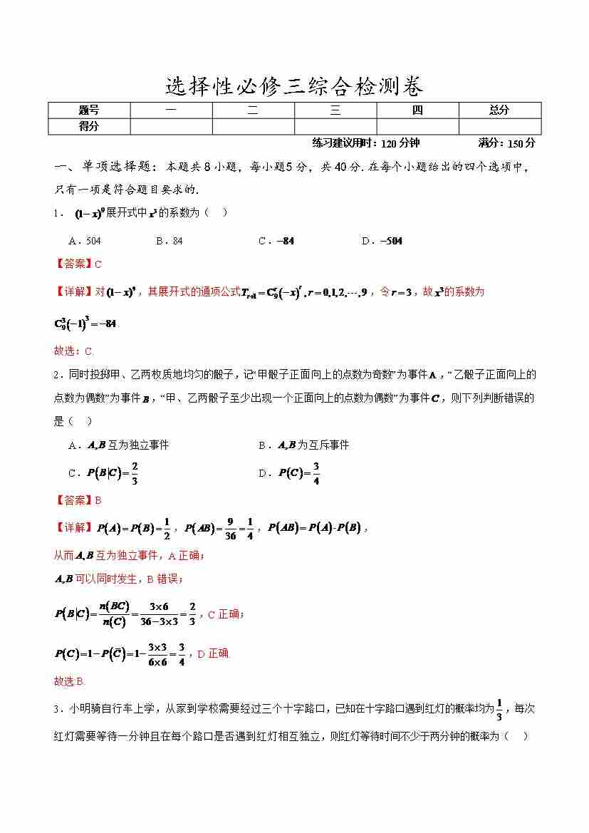 选择性必修三综合检测卷(学生版)