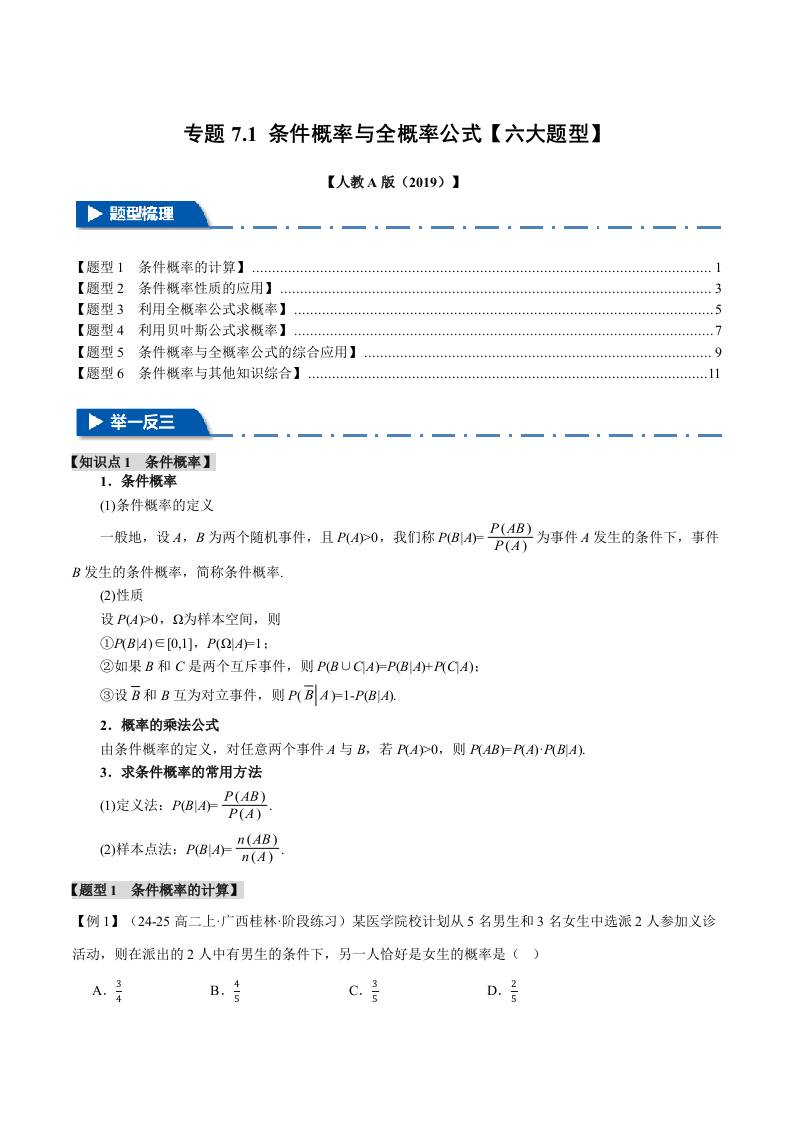 专题7.1 条件概率与全概率公式(六大题型)(举一反三)(人教A版2019选择性必修第三册)(学生版)