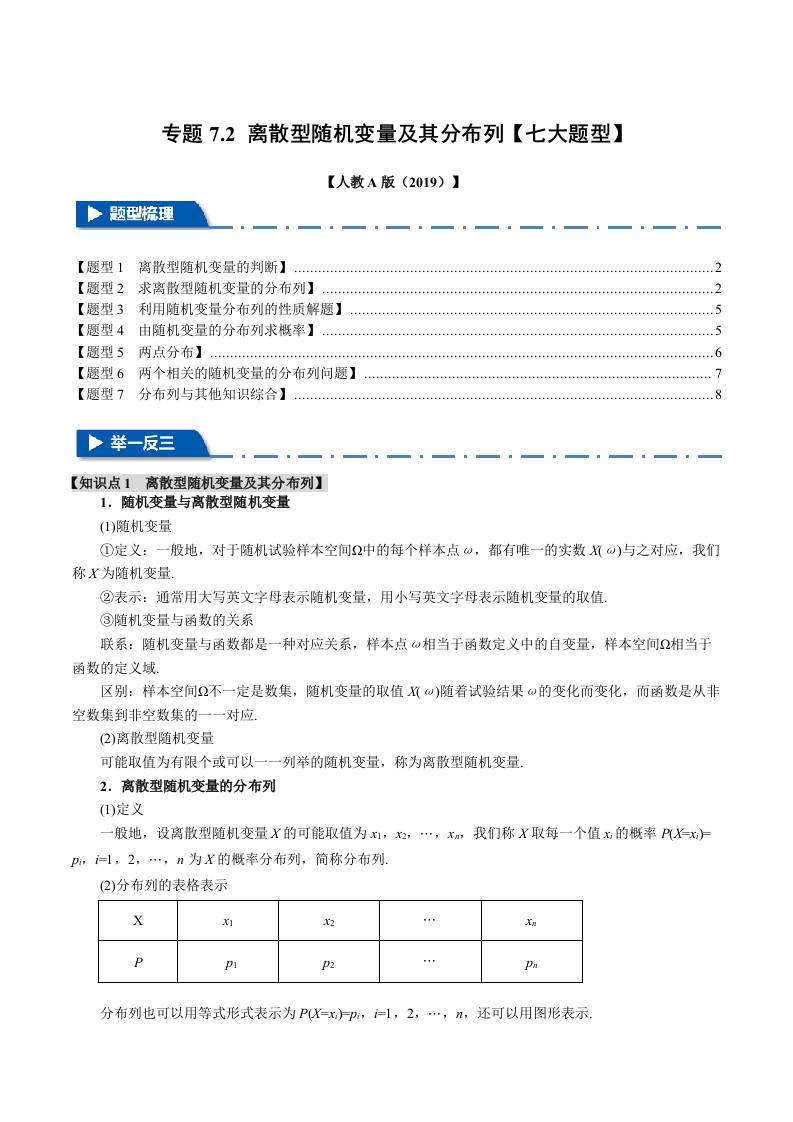 专题7.2 离散型随机变量及其分布列(七大题型)(举一反三)(人教A版2019选择性必修第三册)(学生版)