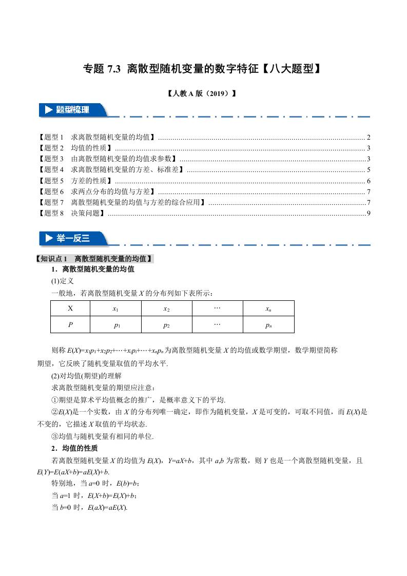 专题7.3 离散型随机变量的数字特征(八大题型)(举一反三)(人教A版2019选择性必修第三册)(学生版)