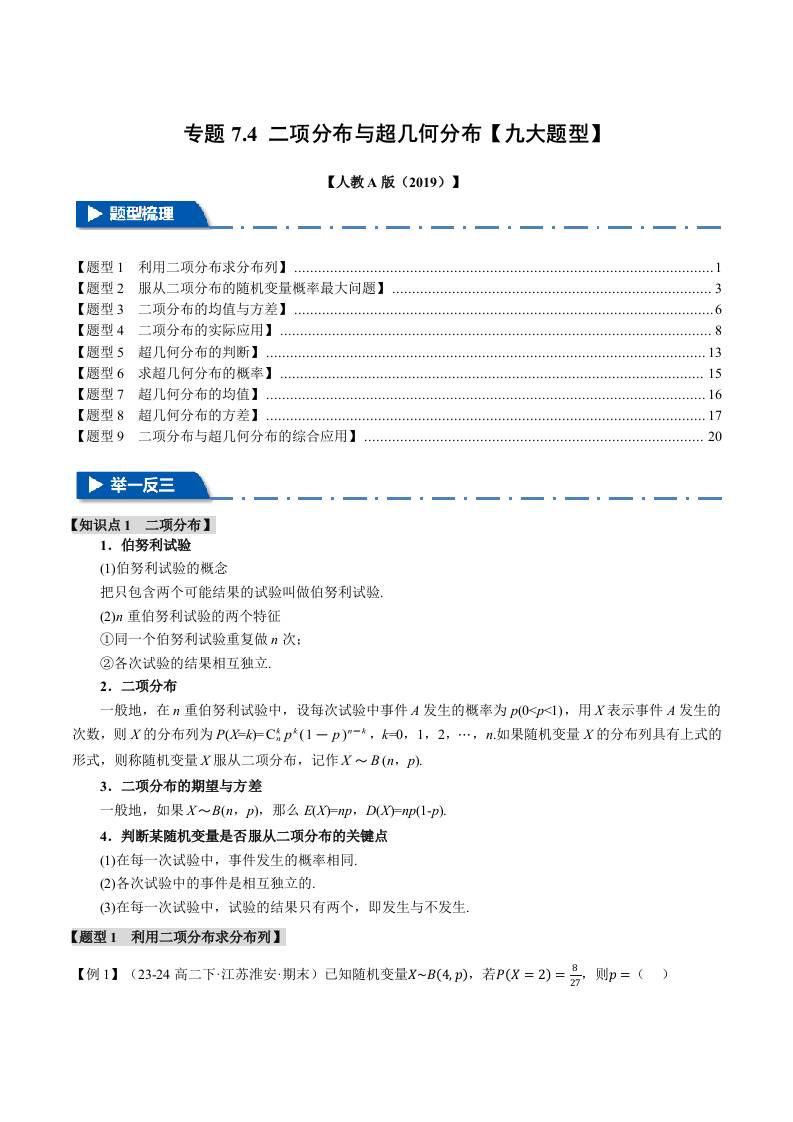 专题7.4 二项分布与超几何分布(九大题型)(举一反三)(人教A版2019选择性必修第三册)(学生版)