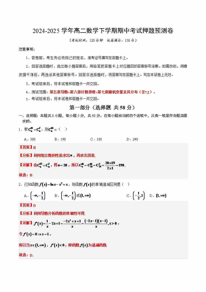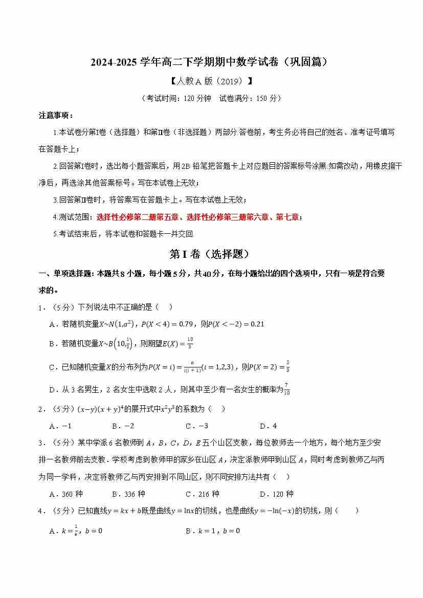 高二数学下学期期中考试押题预测卷(试题)(测试范围:第五章导数+第六章计数原理+第七章随机变量及其分布(至7.2))(人教A版2019)
