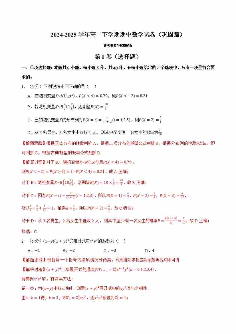 高二下学期期中数学试卷(巩固篇)(教师版)