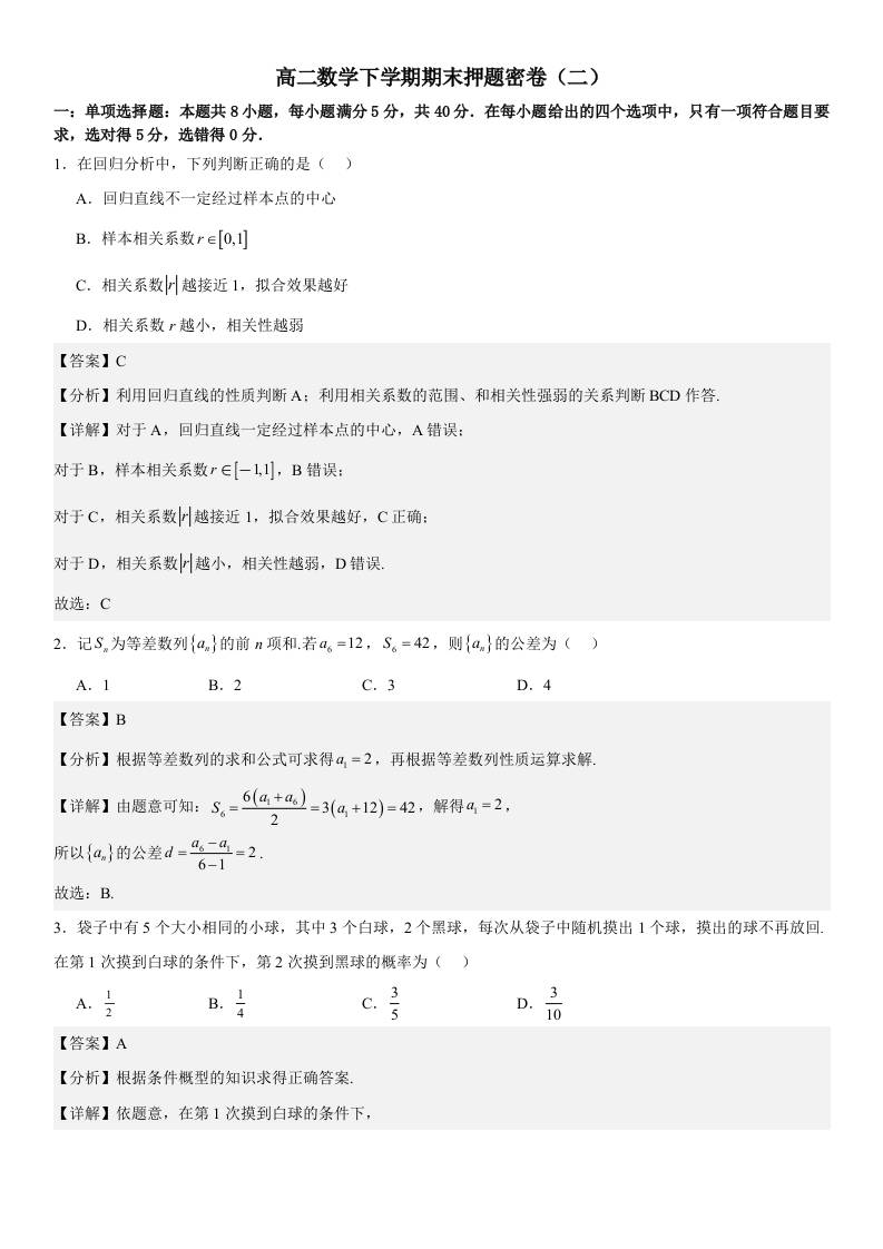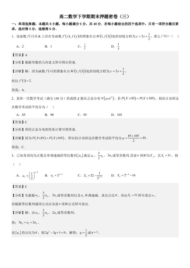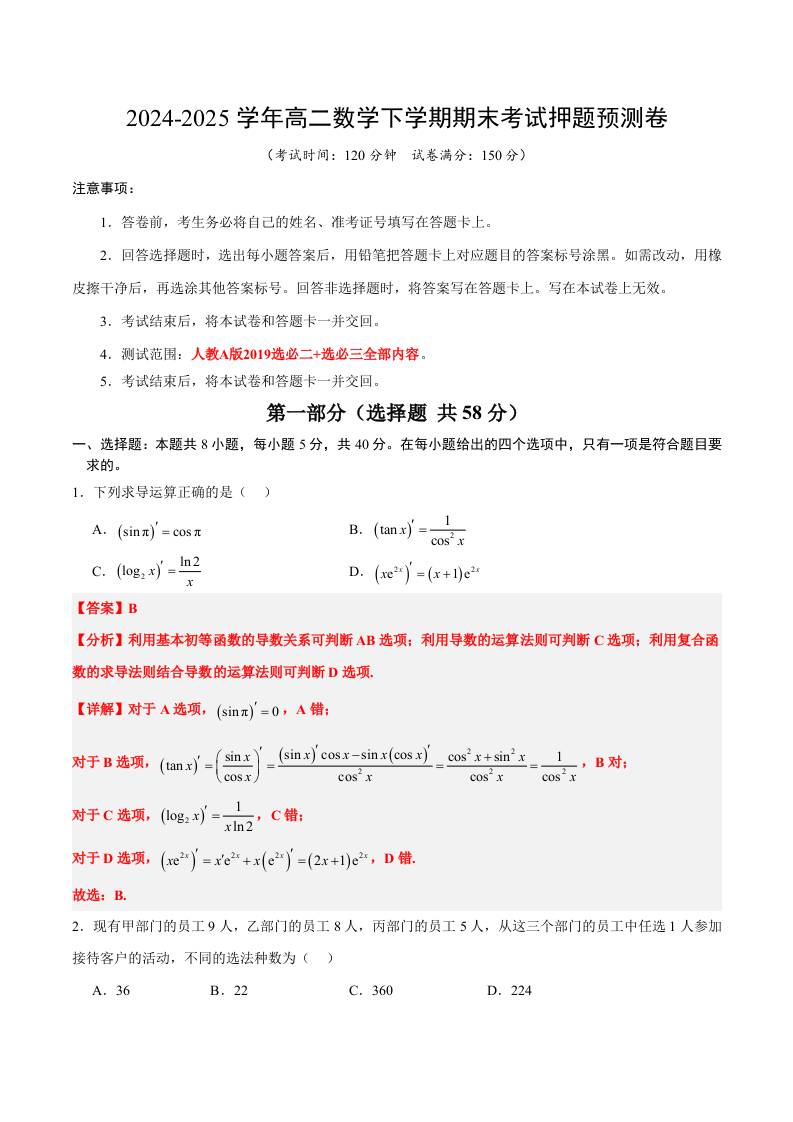 高二数学下学期期末考试押题预测卷(全解全析)(人教A版2019)