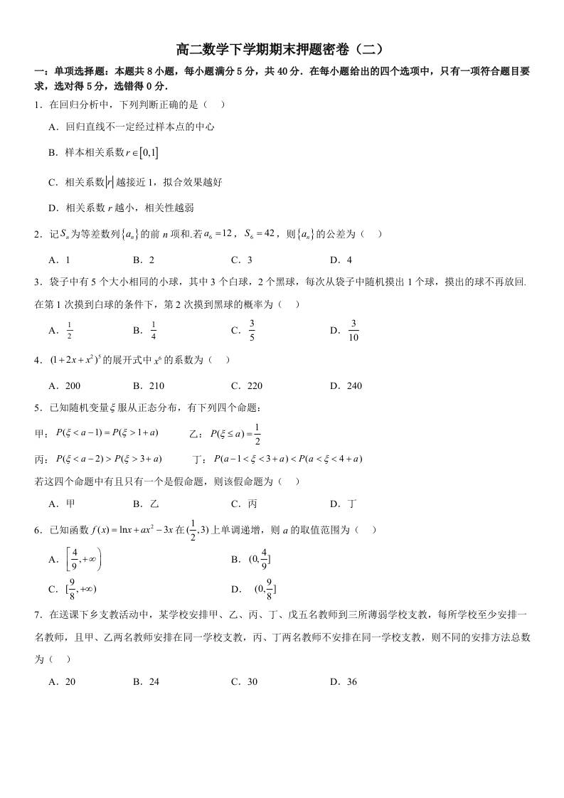高二数学期末模拟卷二(学生版)-(人教A版选修第三册)