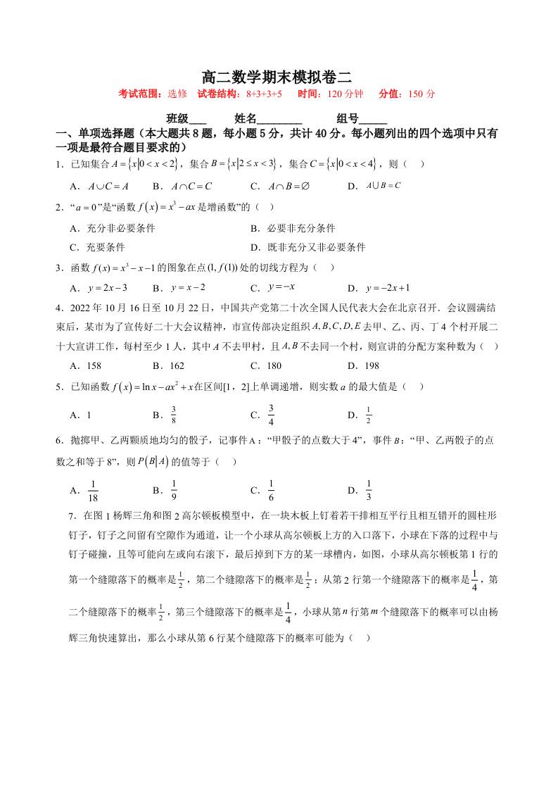高二数学下学期期末考试押题预测卷(试题)(测试范围:人教A版选必二+选必三全部内容)(人教A版2019)
