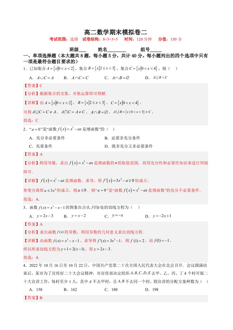高二数学期末模拟卷二(教师版)-(人教A版选修第三册)
