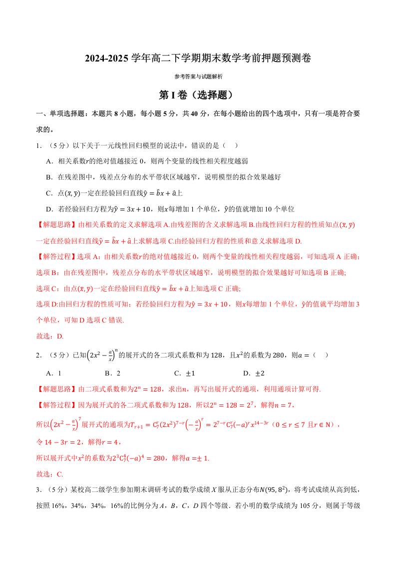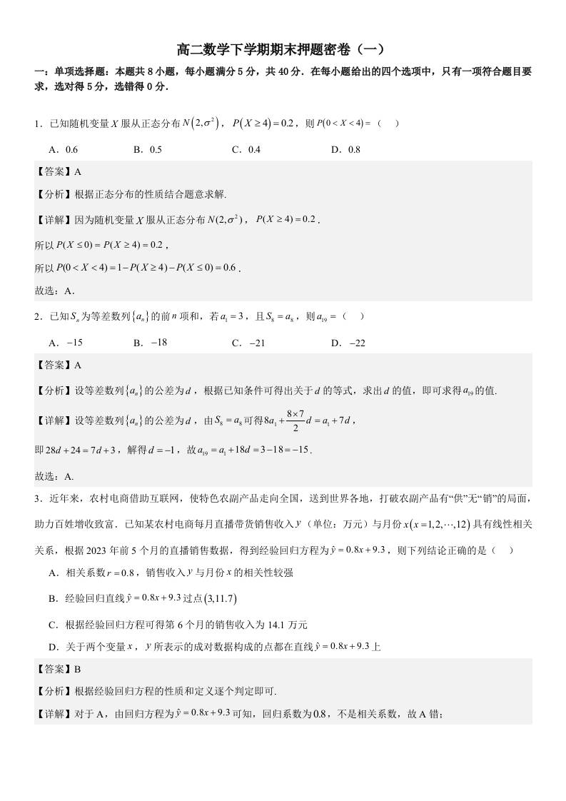 高二下学期期末数学考前押题预测卷(教师版)