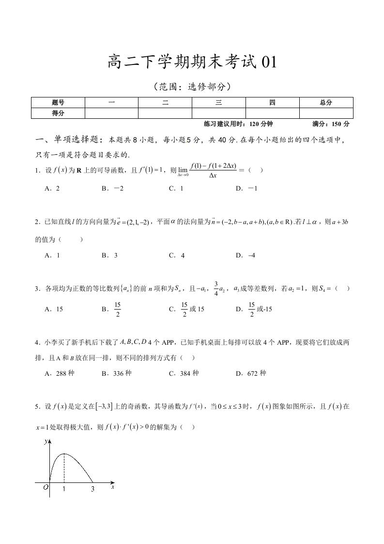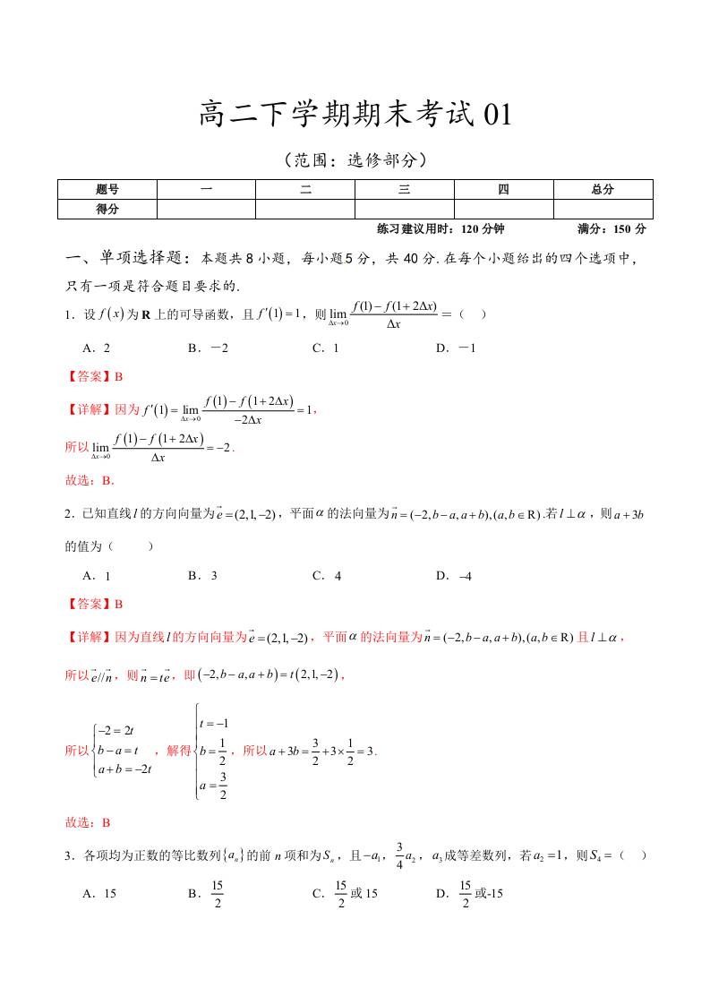 高二下学期期末考试01(范围:选修部分)(学生版)