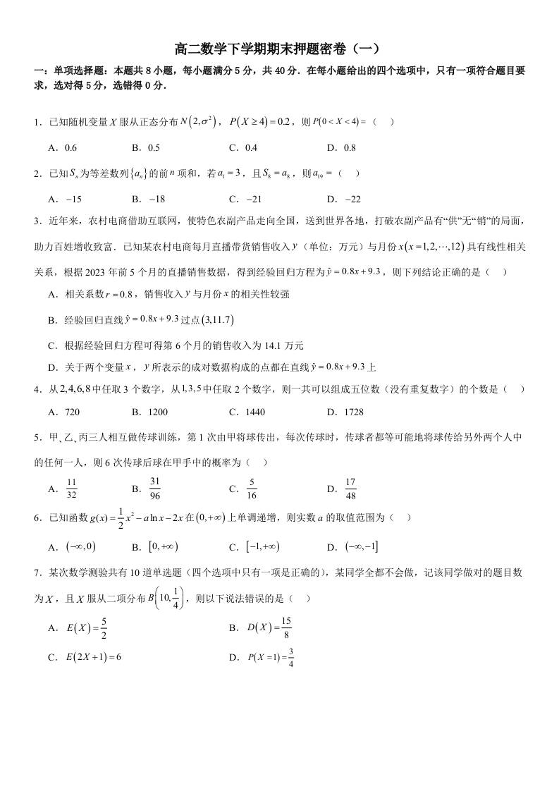 高二数学下学期期末押题密卷(一)学生版