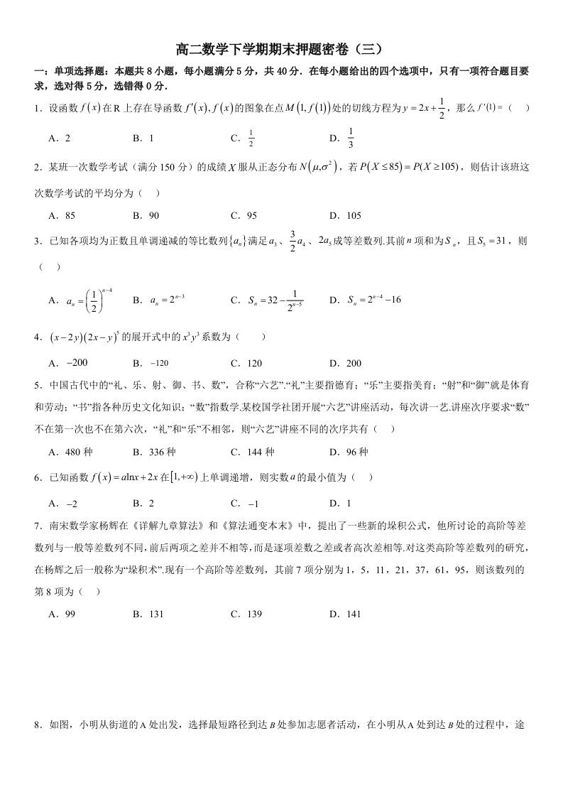 高二数学下学期期末押题密卷(三)学生版