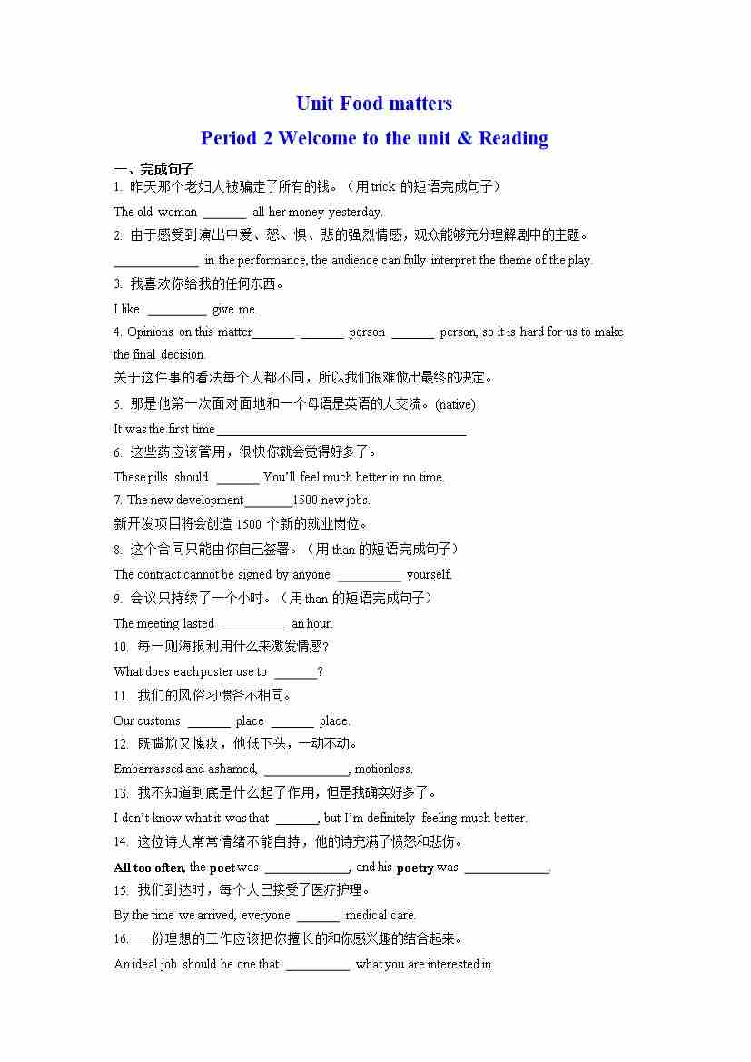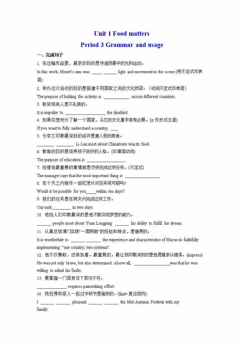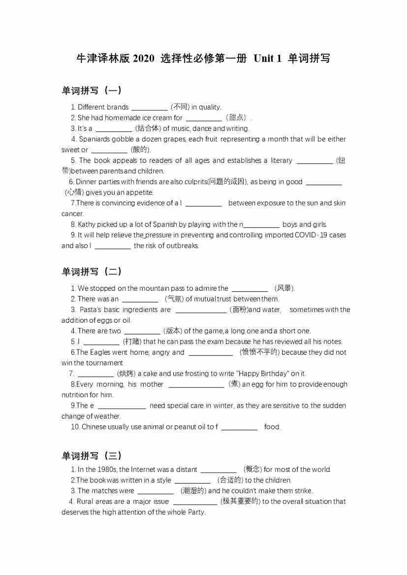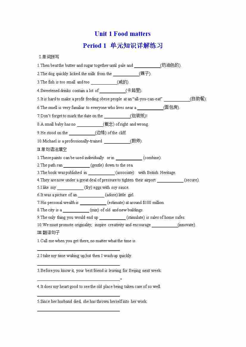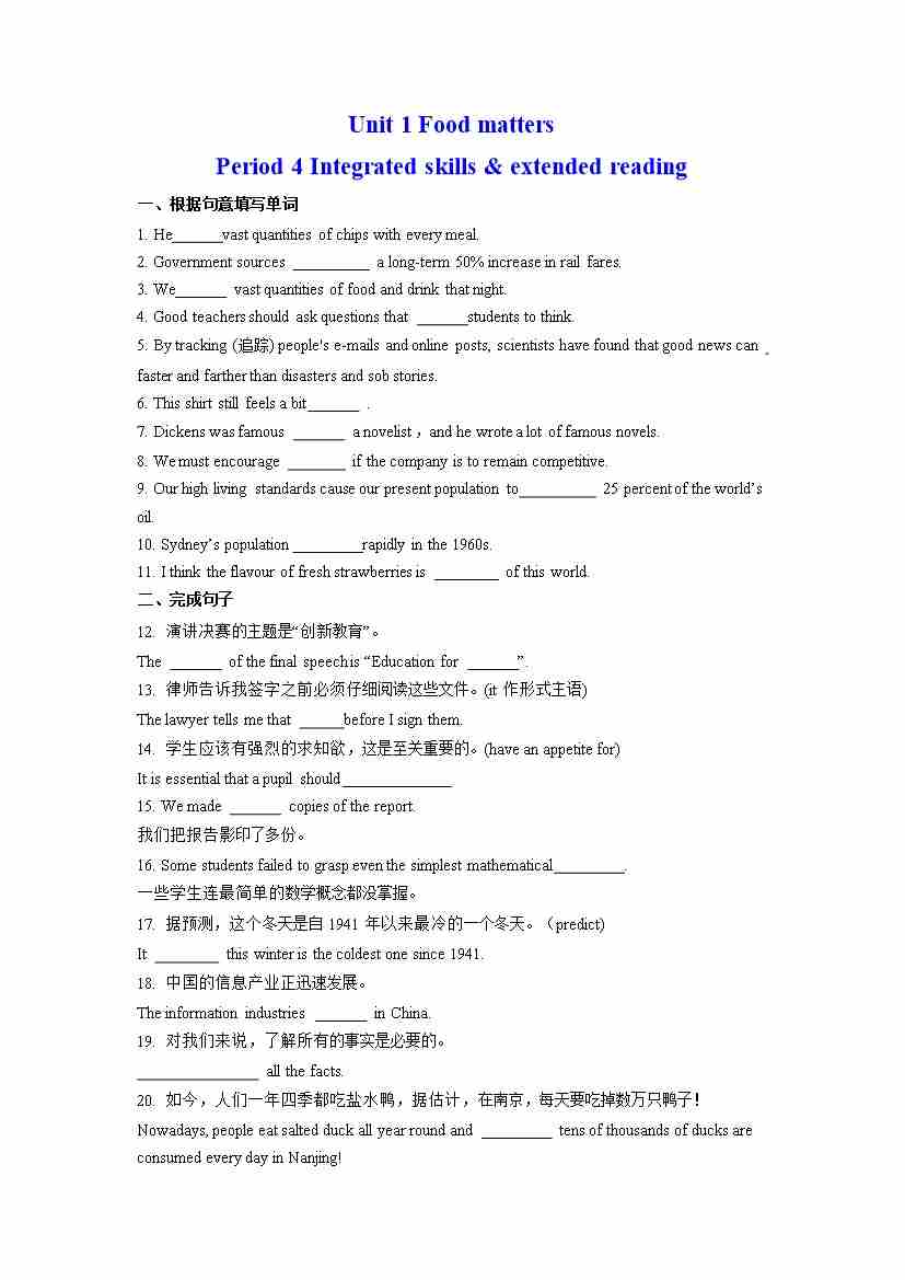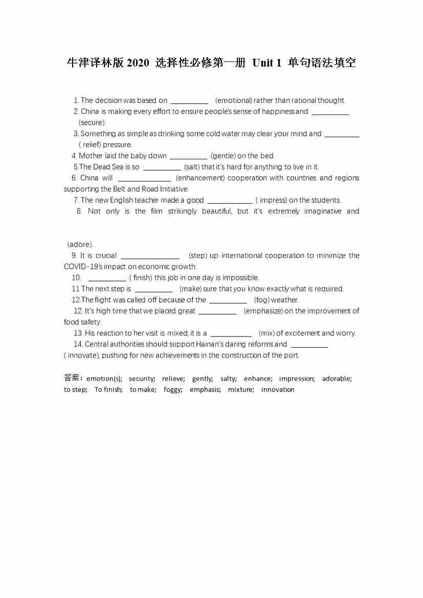 Unit 1 单句语法填空(有答案)