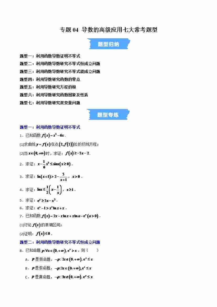 专题04 导数的高级应用七大常考题型(高效培优专项训练)(学生版)