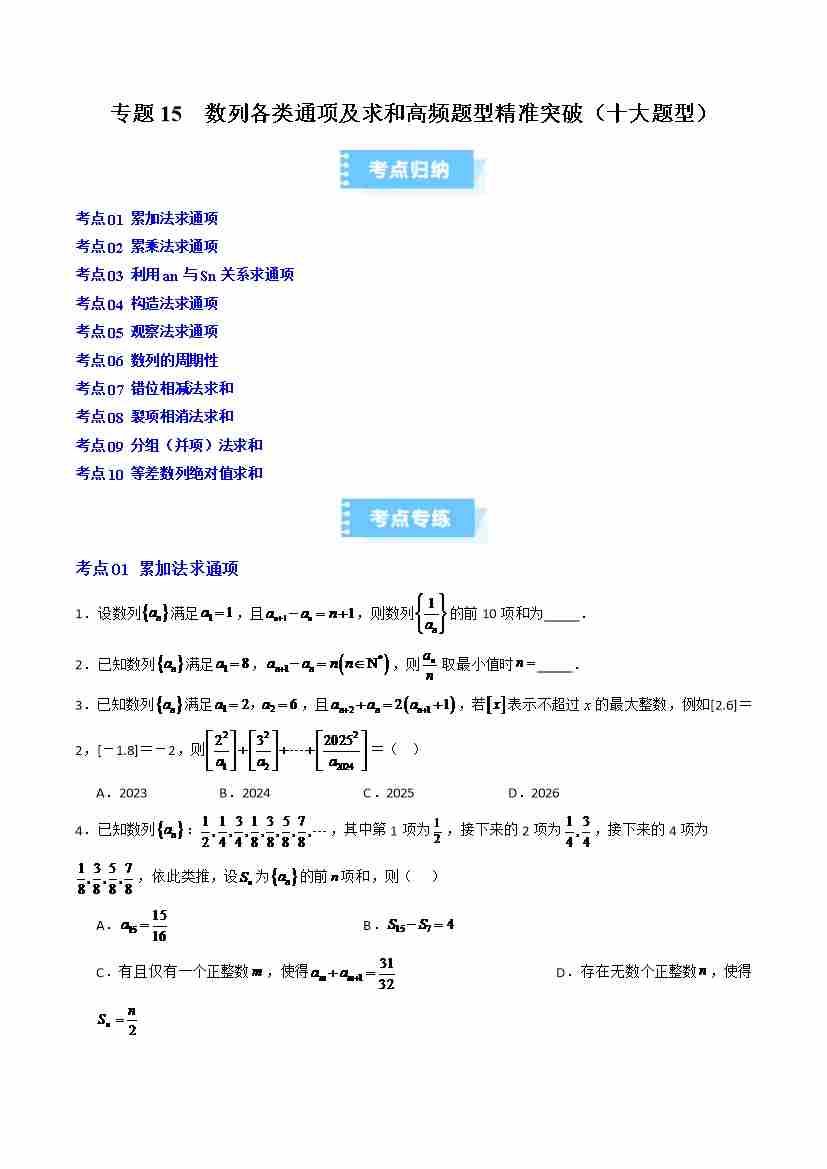 专题15 数列各类通项及求和高频题型精准突破(十大题型)(高效培优期末专项训练)(原卷版)