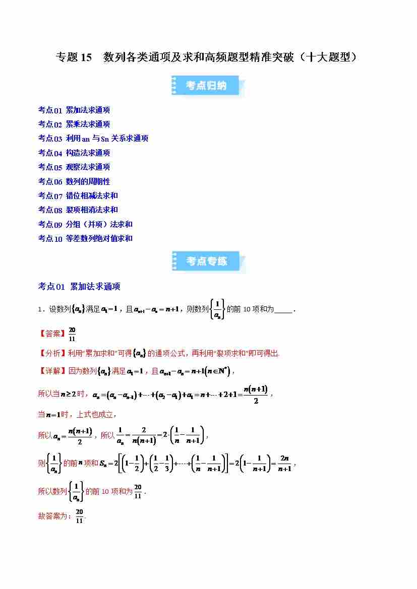 专题15 数列各类通项及求和高频题型精准突破(十大题型)(高效培优期末专项训练)(解析版)