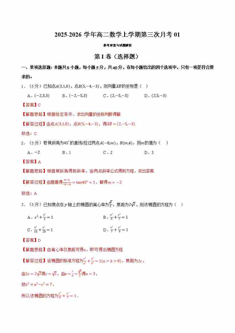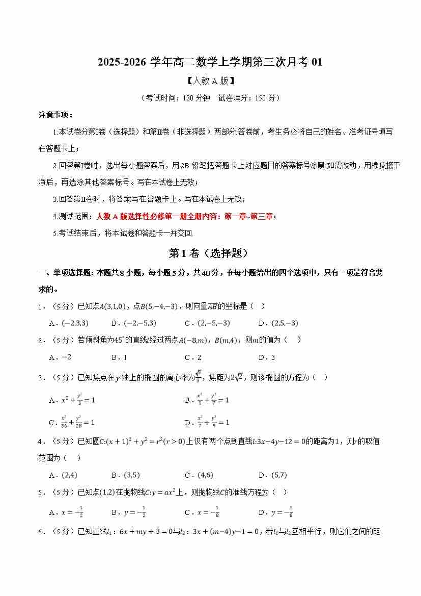 高二数学上学期第三次月考01(人教A版,举一反三)(学生版)
