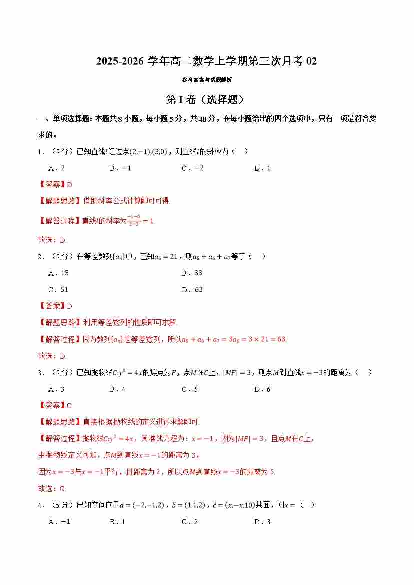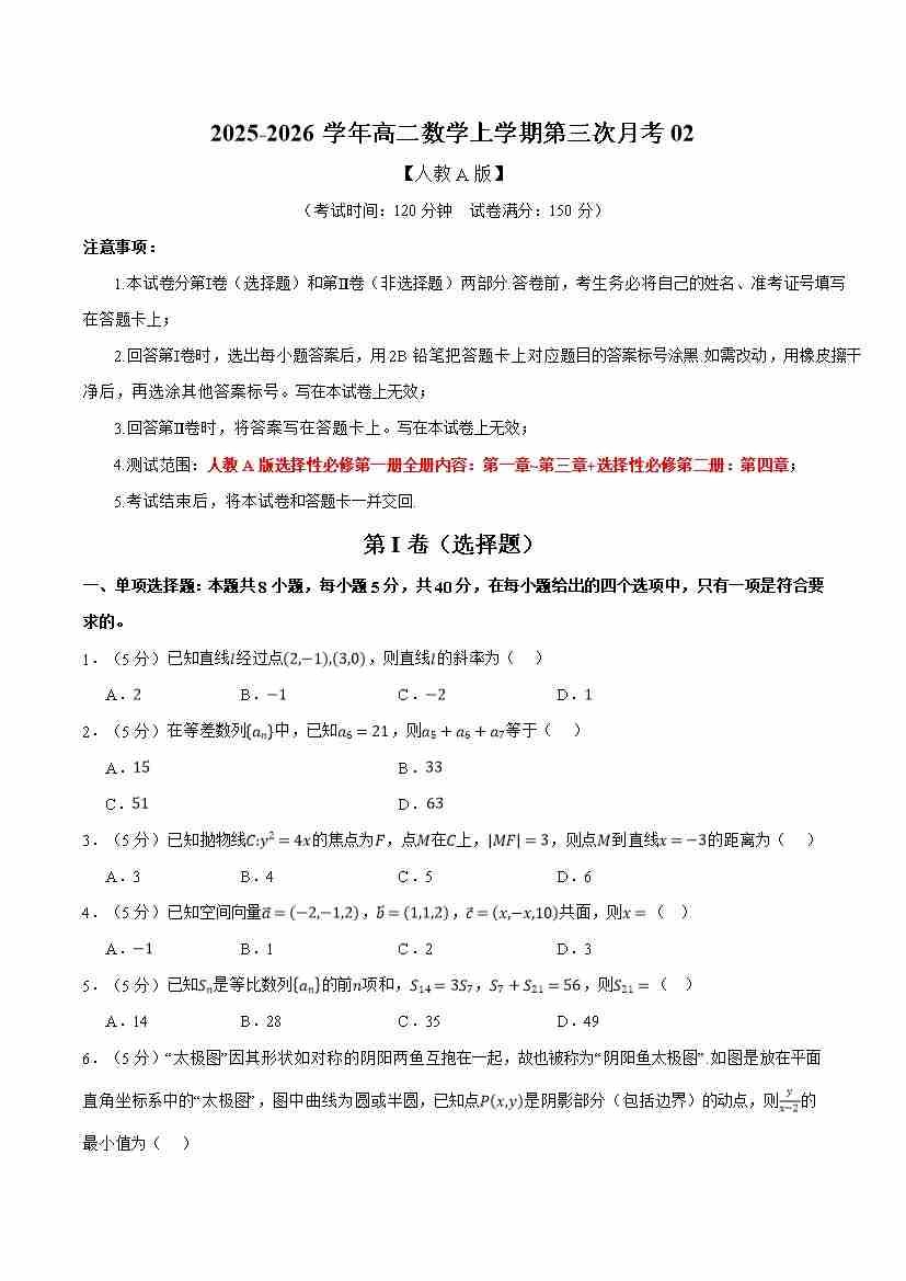 高二数学上学期第三次月考02(人教A版,举一反三)(学生版)