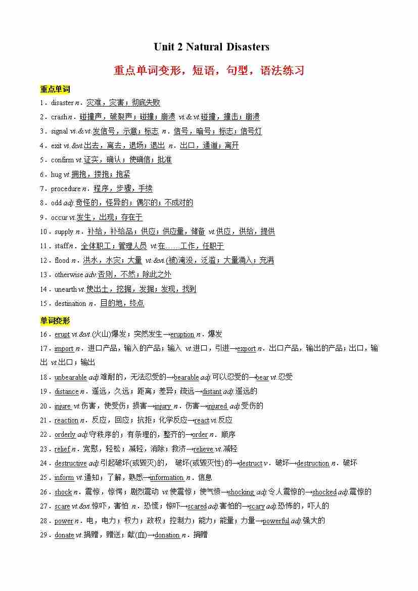 Unit 2 Natural Disasters重点单词变形,短语,句型,语法练习(教师版)