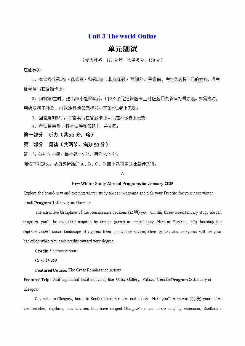 Unit 3 The world Online 单元测试-(译林版2020)