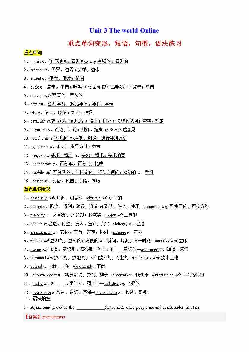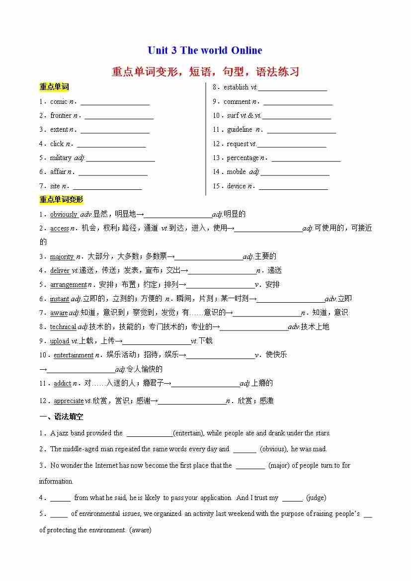 Unit 3 The world Online 重点单词变形,短语,句型,语法练习(教师版)