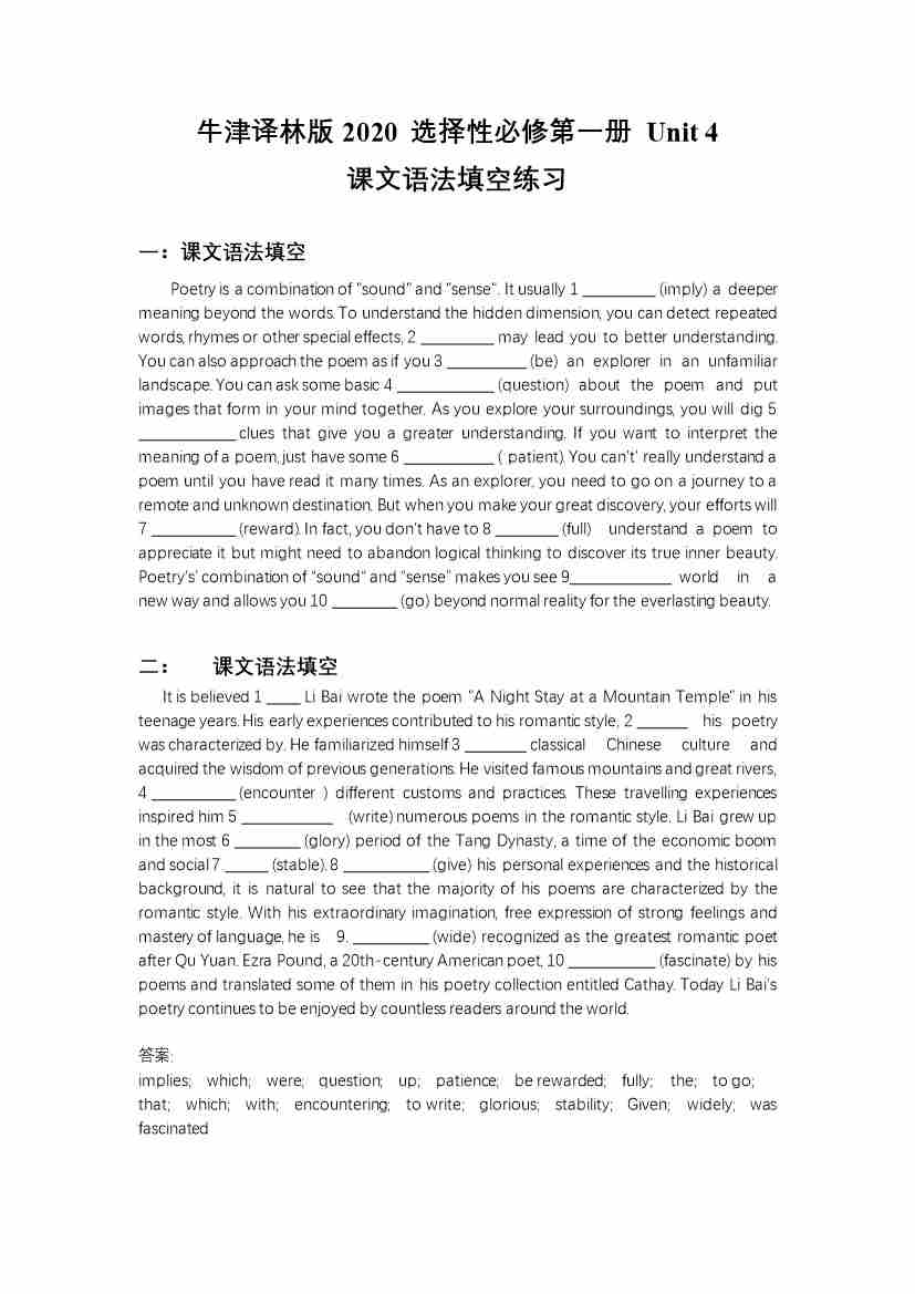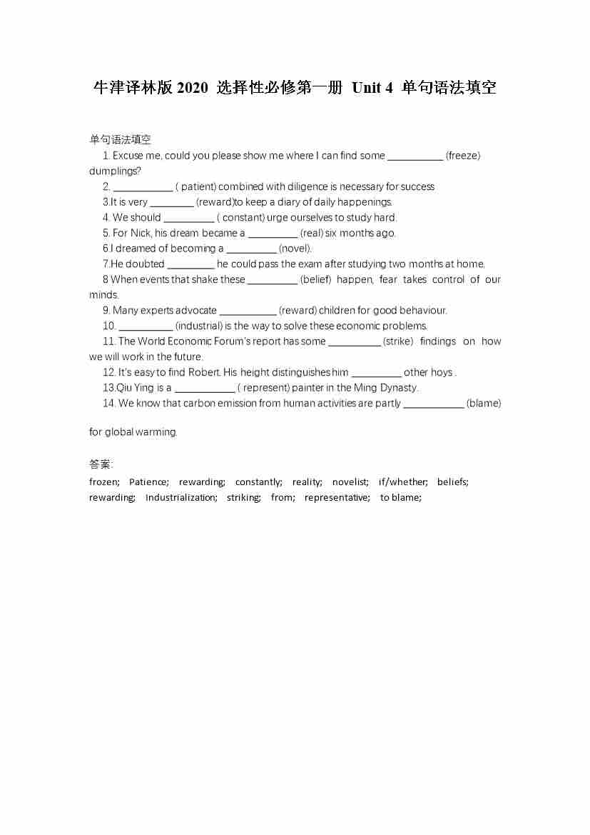 Unit 4 单句语法填空(有答案)