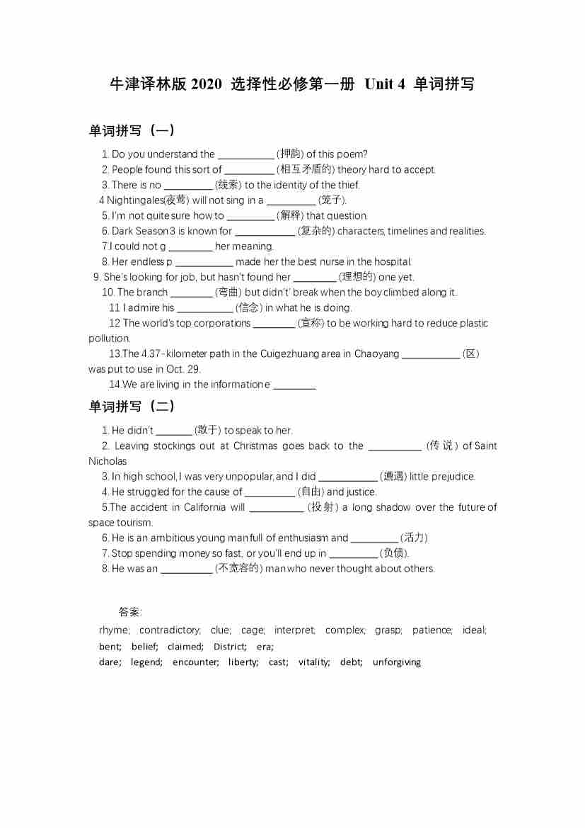 选择性必修第一册Unit 4 完成句子(有答案)