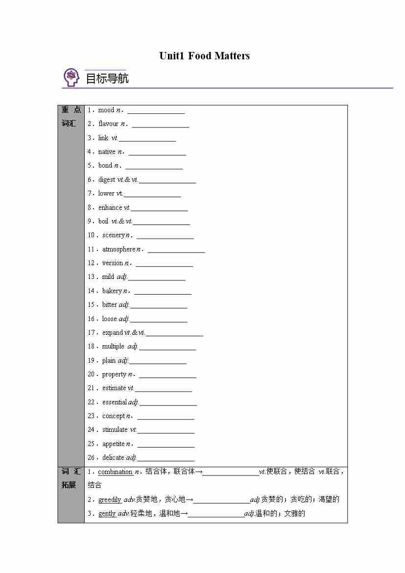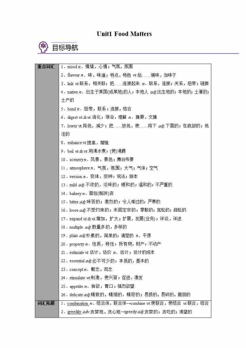 选择性必修第一册 Unit1 Food Matters(学生版)