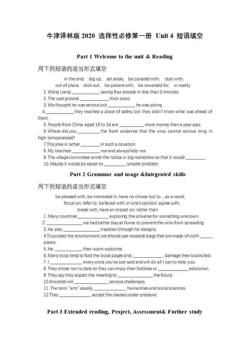 选择性必修第一册Unit 4 短语填空(有答案)