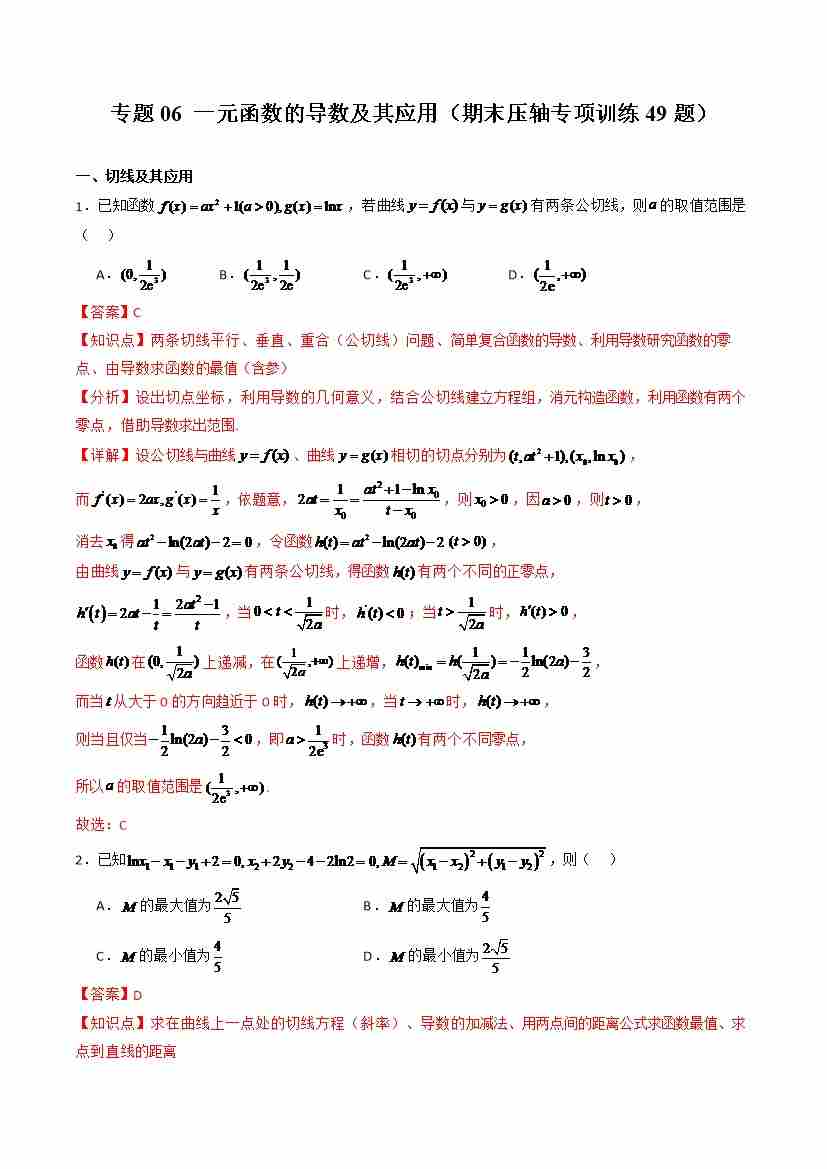 专题06 一元函数的导数及其应用(期末压轴专项训练49题)(教师版)