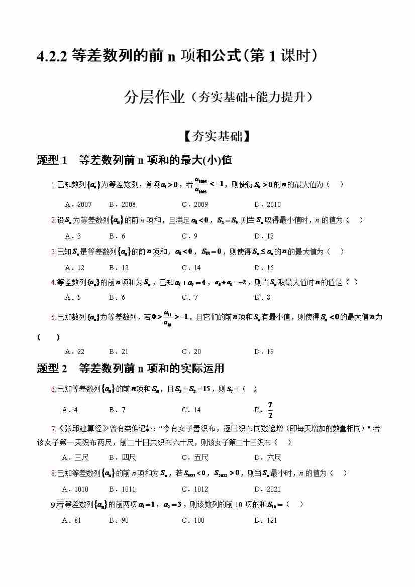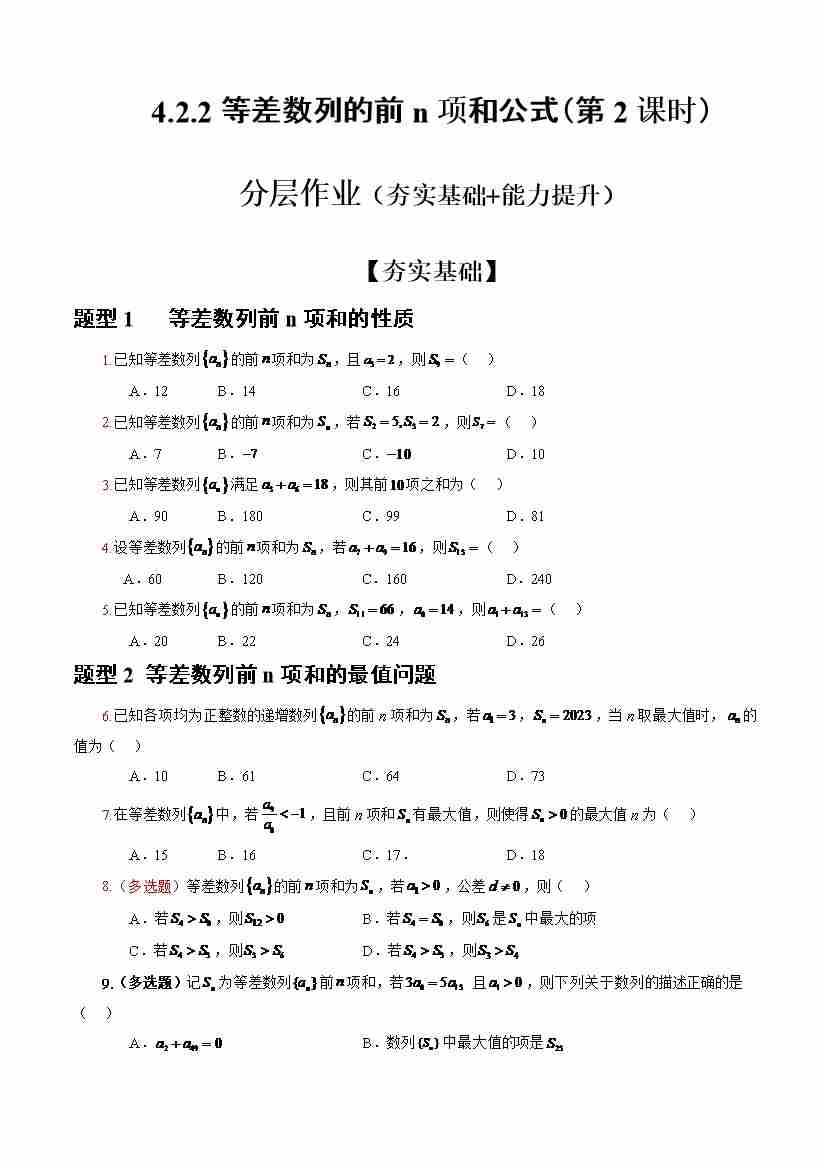 4.2.2等差数列的前n项和公式(第2课时)(分层作业)(原卷版)-(人教A版2019选择性必修第二册)
