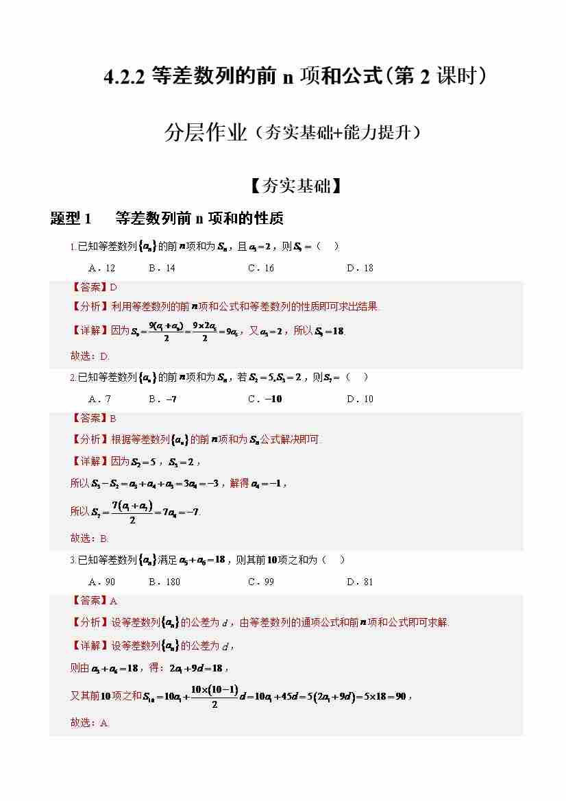 4.2.2等差数列的前n项和公式(第2课时)(分层作业)(解析版)-(人教A版2019选择性必修第二册)