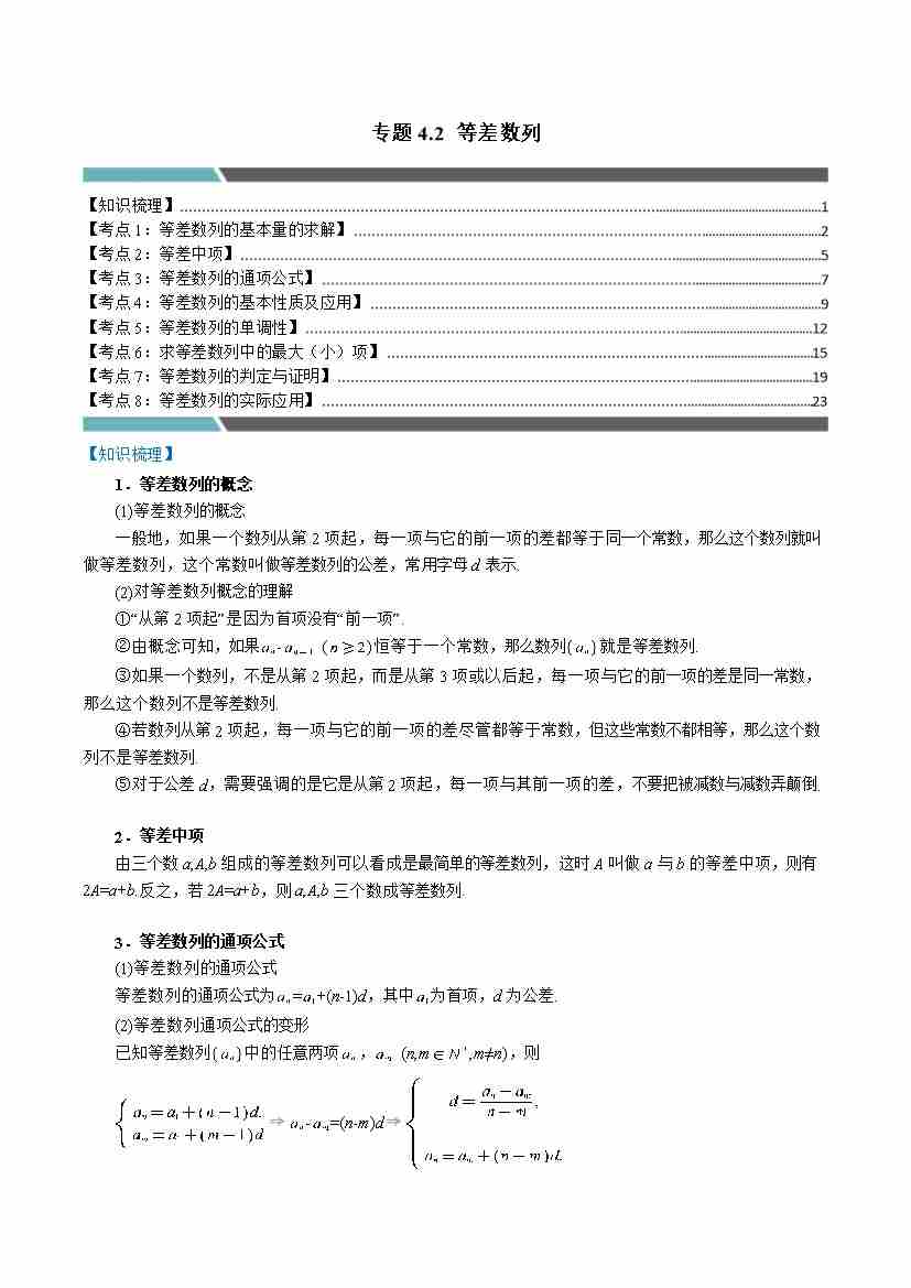 专题4.2 等差数列(8类必考点)(人教A版2019选择性必修第二册)(教师版)