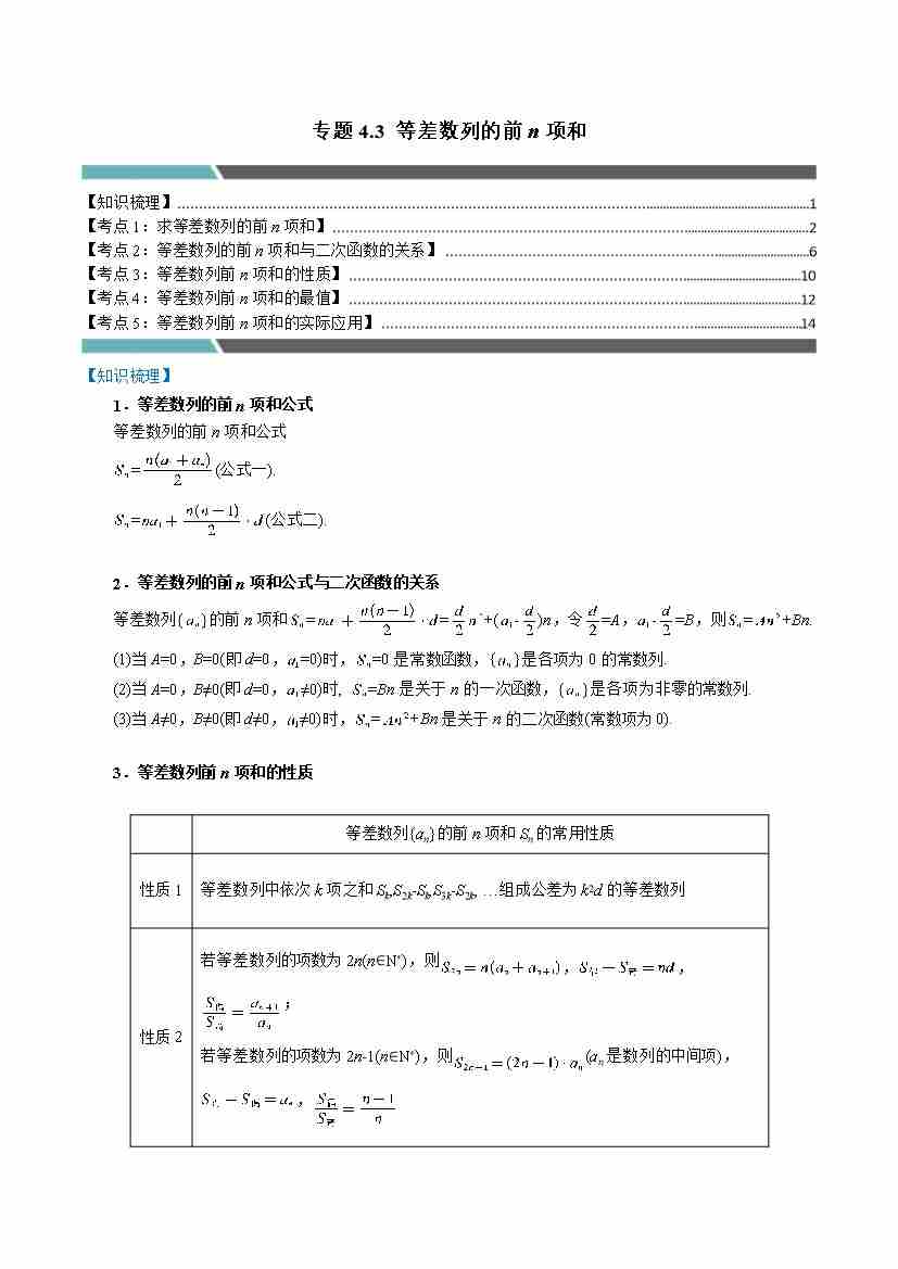专题4.3 等差数列的前n项和(5类必考点)(人教A版2019选择性必修第二册)(学生版)