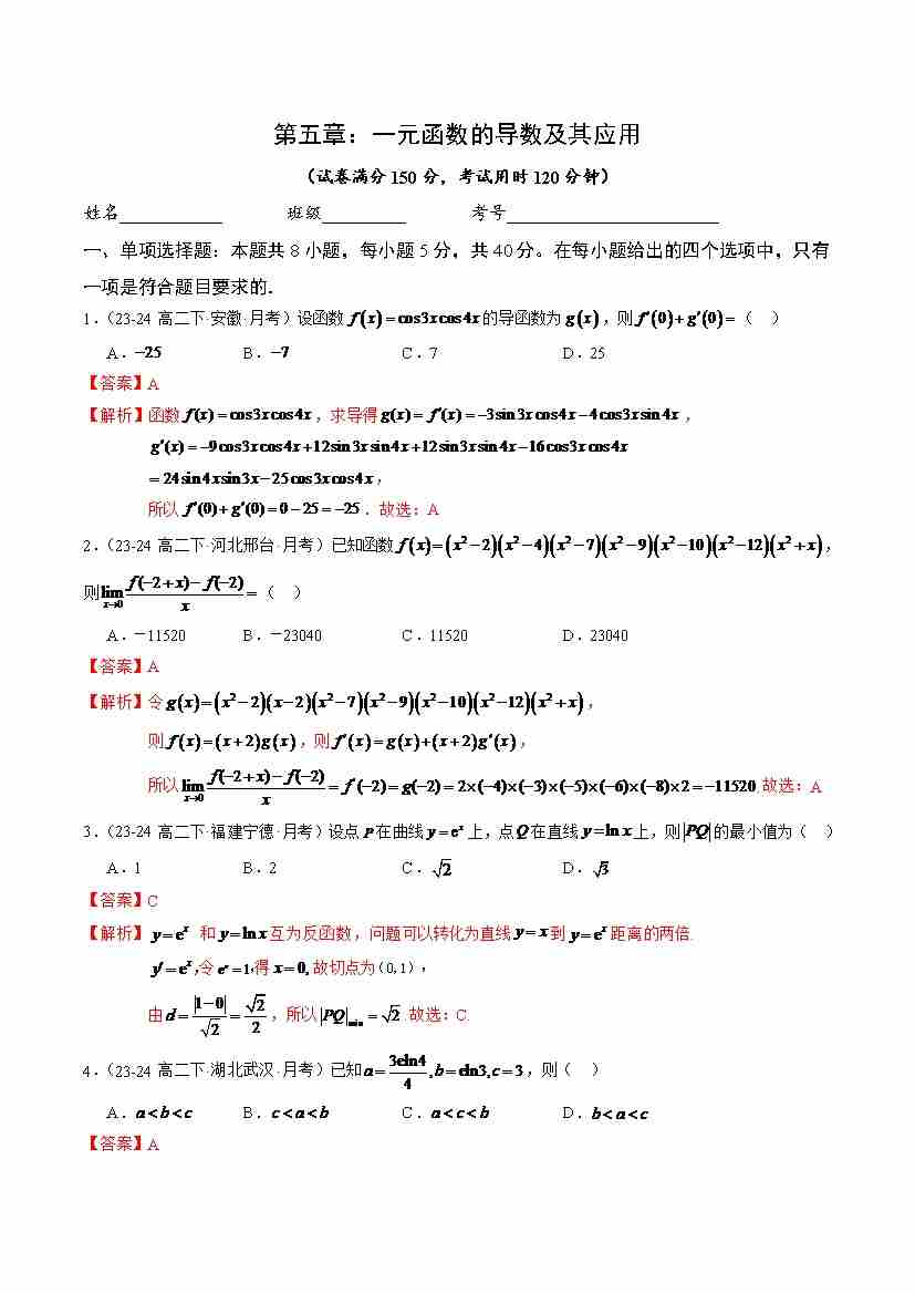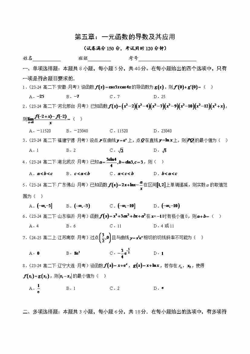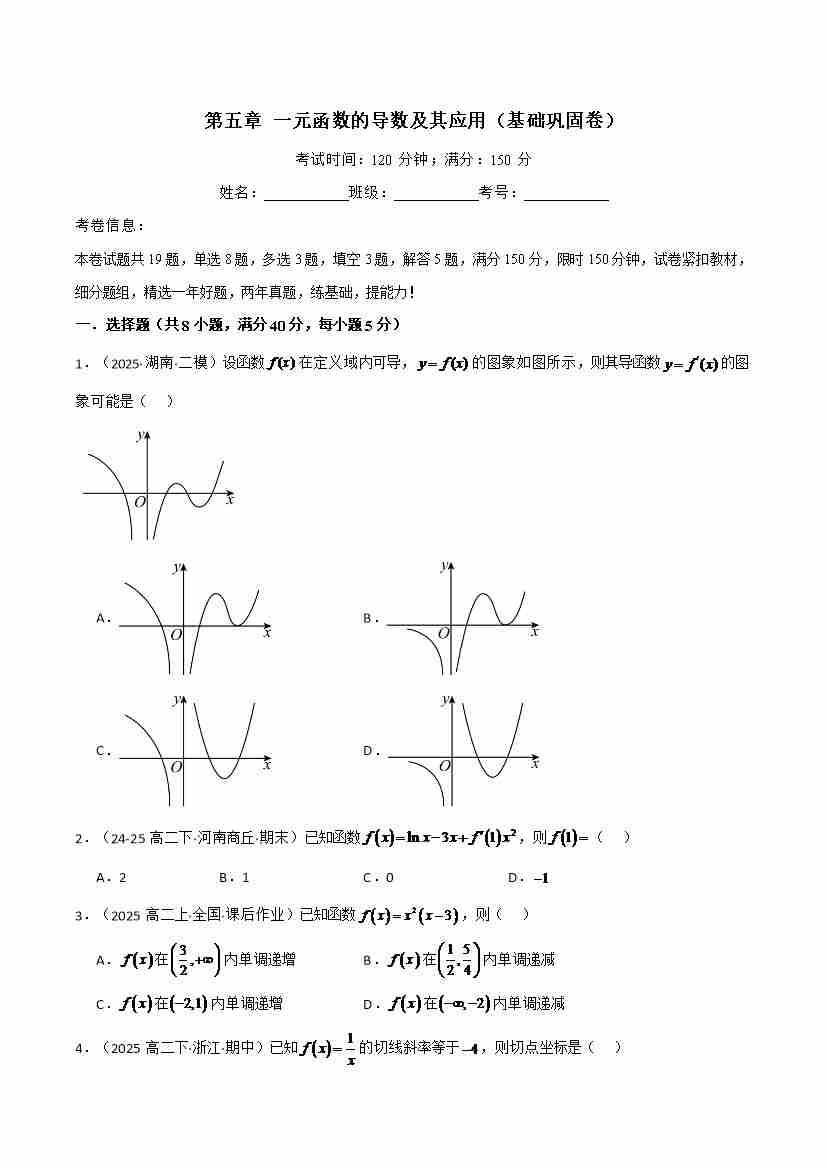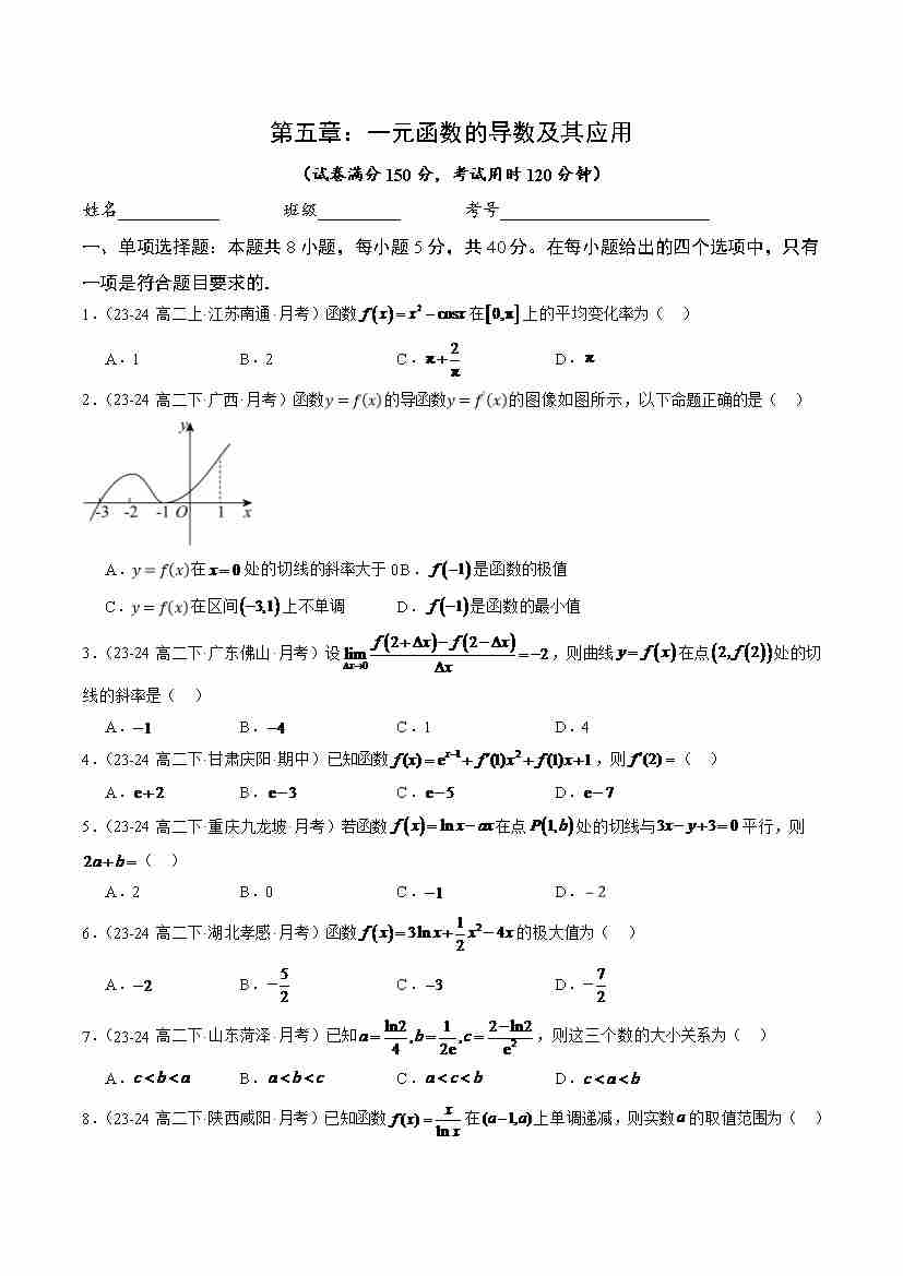 第五章 一元函数的导数及其应用(基础巩固卷)(人教A版2019选择性必修第二册)(学生版)