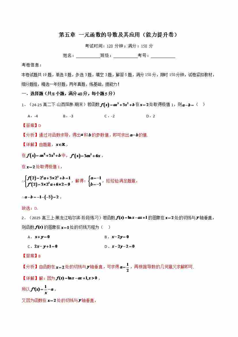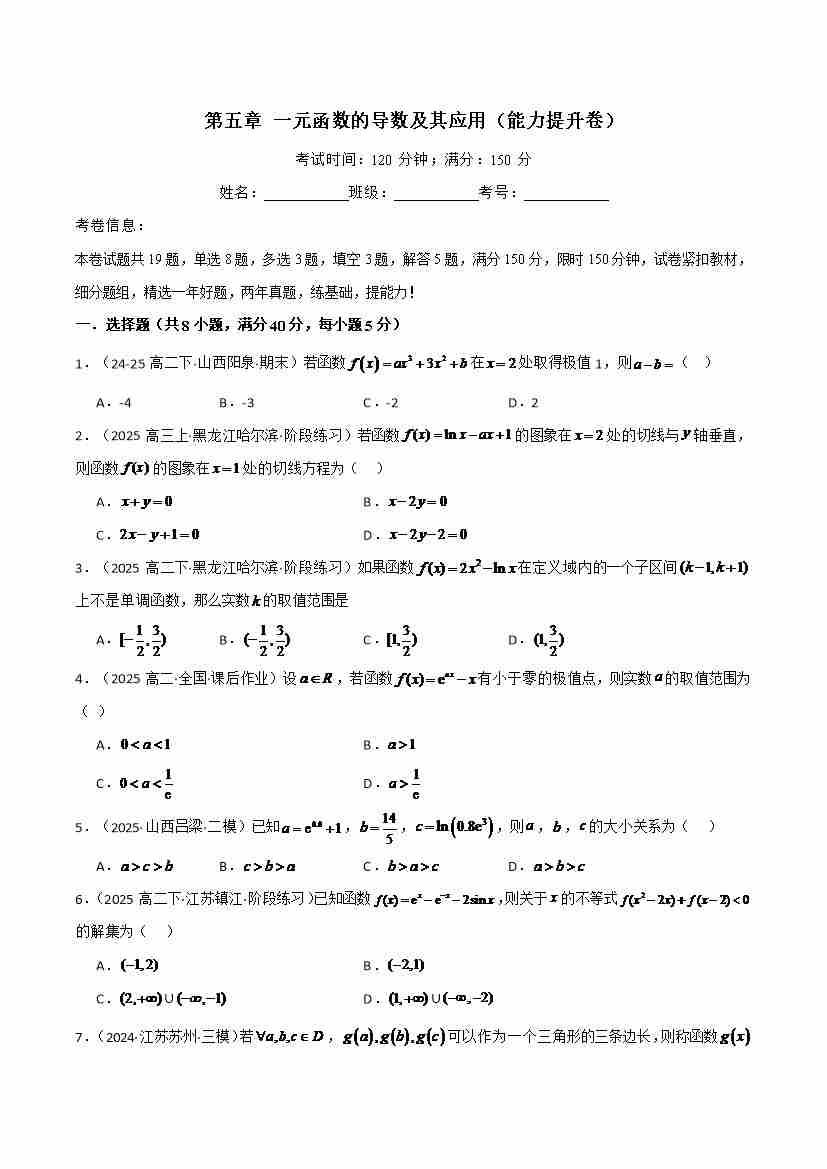 第五章 一元函数的导数及其应用(能力提升卷)(人教A版2019选择性必修第二册)(学生版)