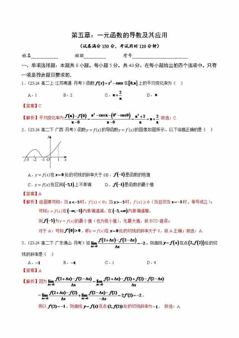 第五章:一元函数的导数及其应用(单元测试,基础卷)(解析版)