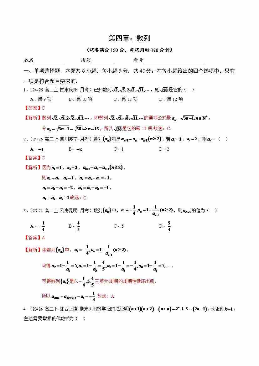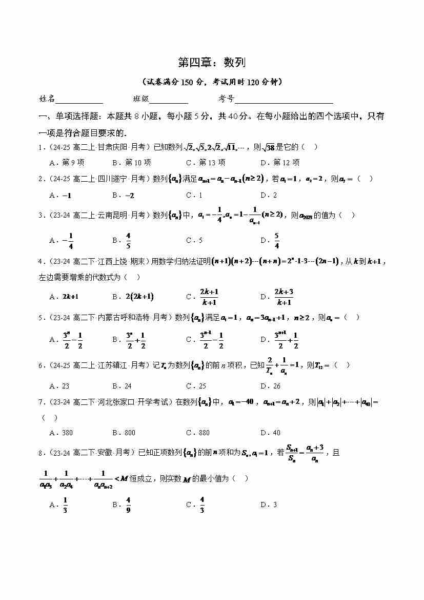 第四章:数列章末综合检测基础卷(原卷版)
