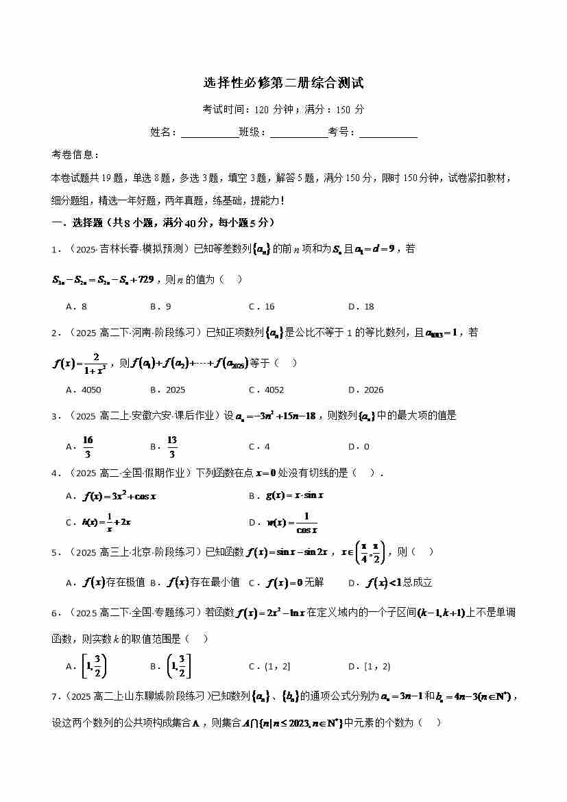 选择性必修第二册综合测试(人教A版2019选择性必修第二册)(学生版)