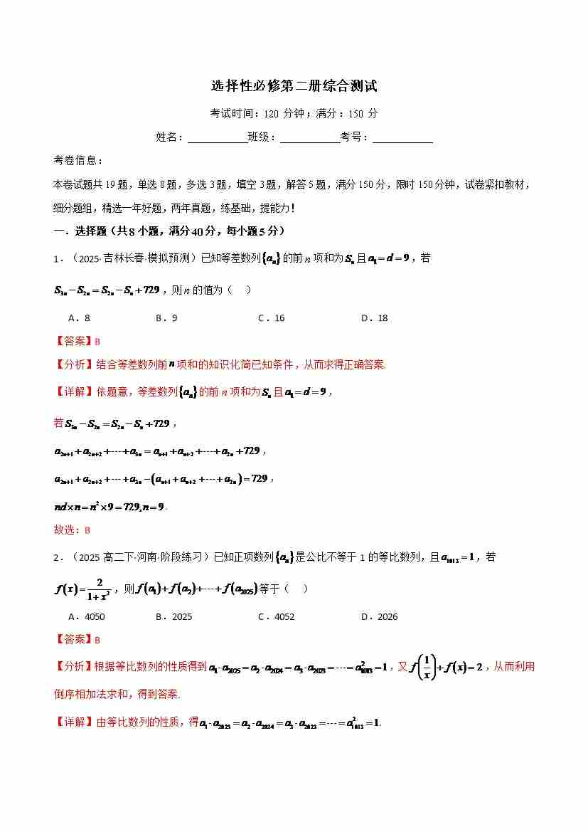 选择性必修第二册综合测试(人教A版2019选择性必修第二册)(教师版)