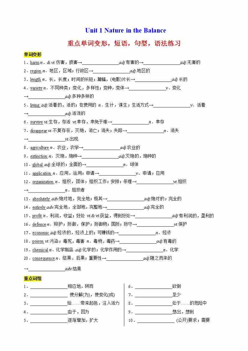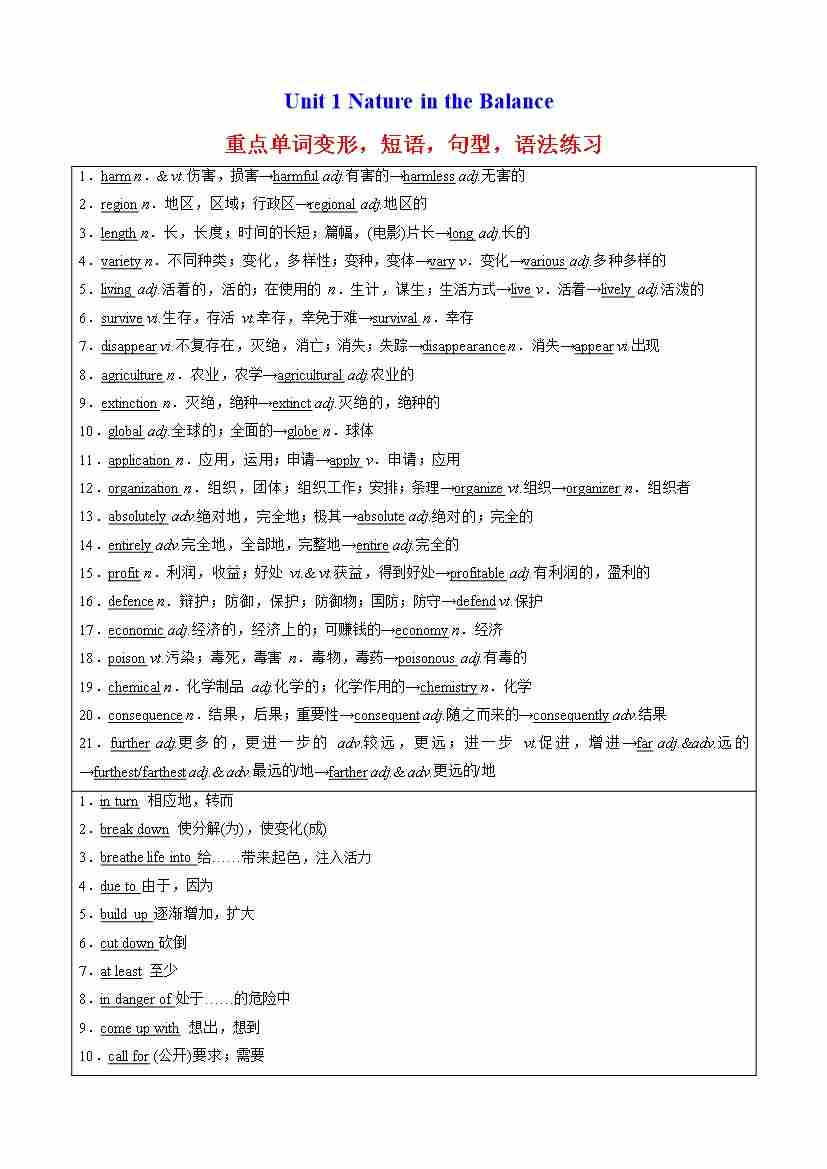 Unit 1 Nature in the Balance重点单词变形,短语,句型,语法练习(教师版)