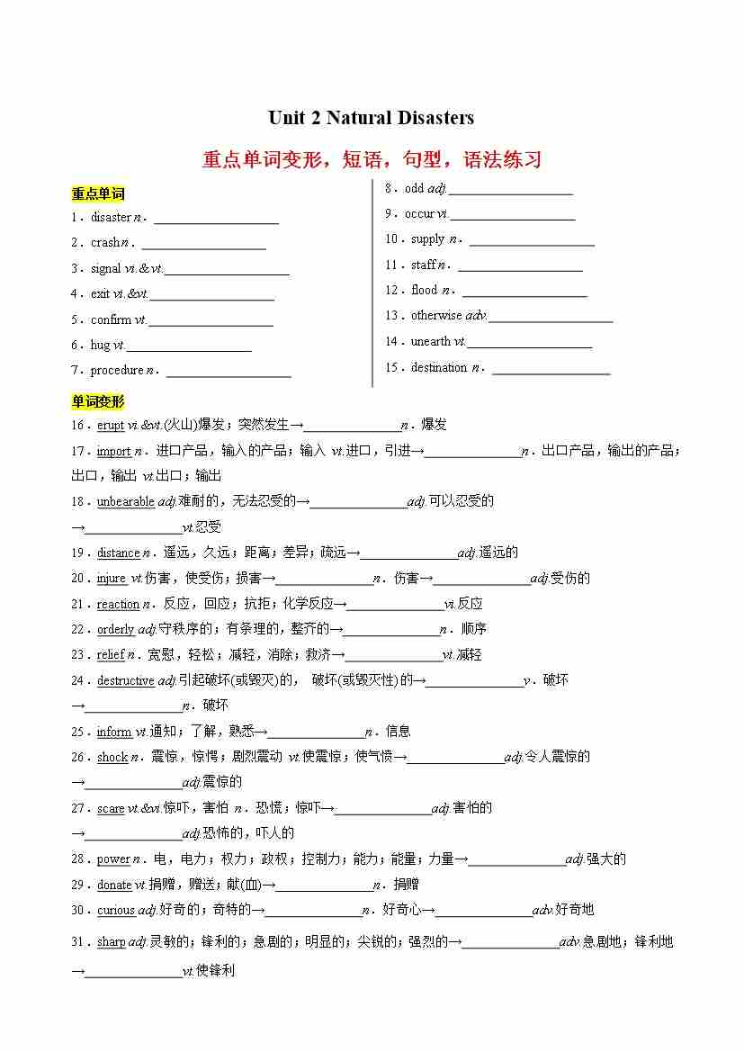 Unit 2 Natural Disasters重点单词变形,短语,句型,语法练习(学生版)