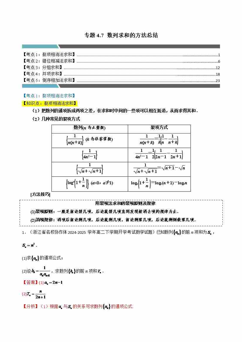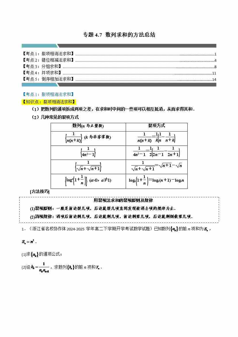 专题4.7 数列求和的方法总结(5类必考点)(人教A版2019选择性必修第二册)(学生版)