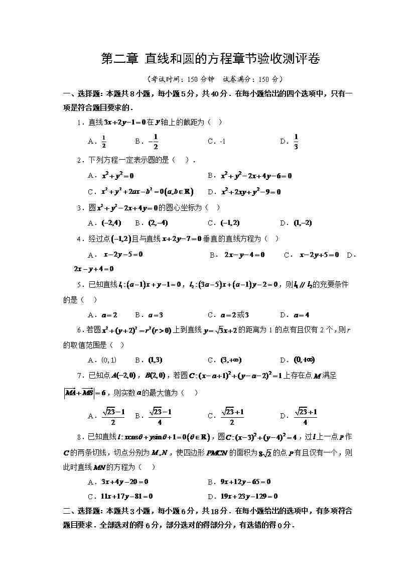 第12讲 第二章 直线和圆的方程 章节验收测评卷(学生版)