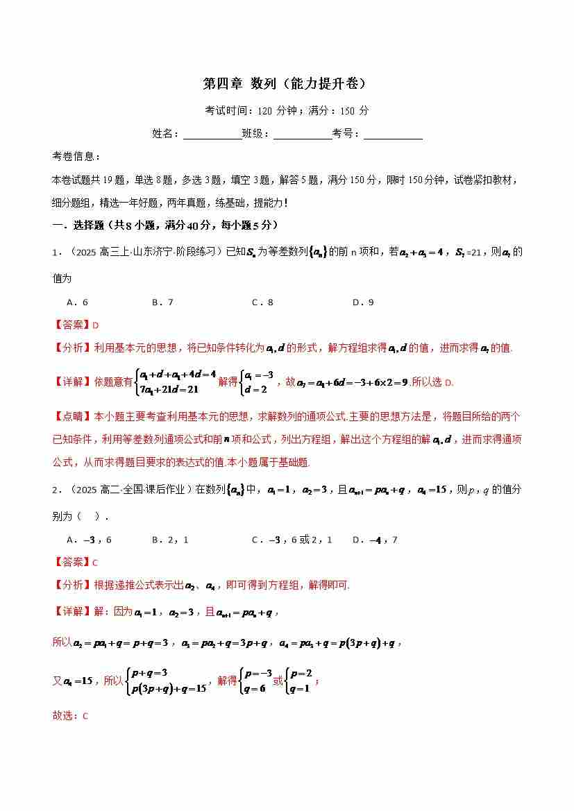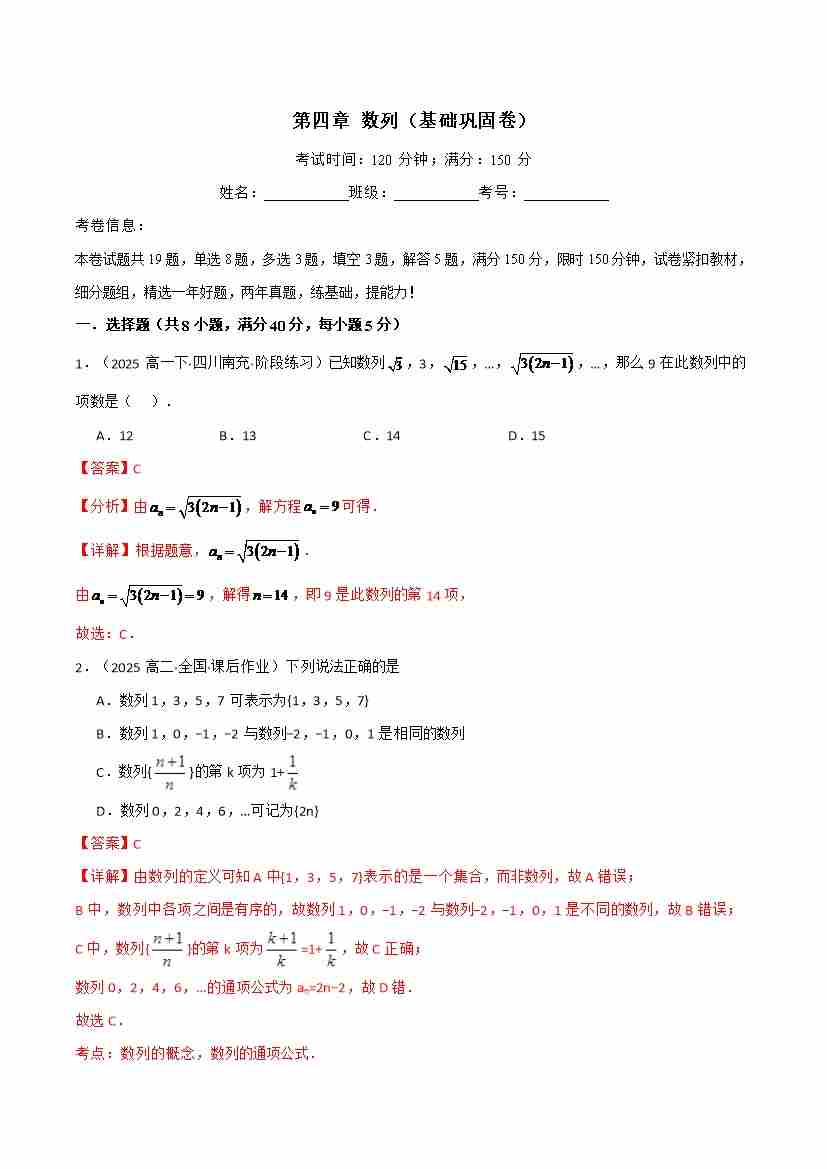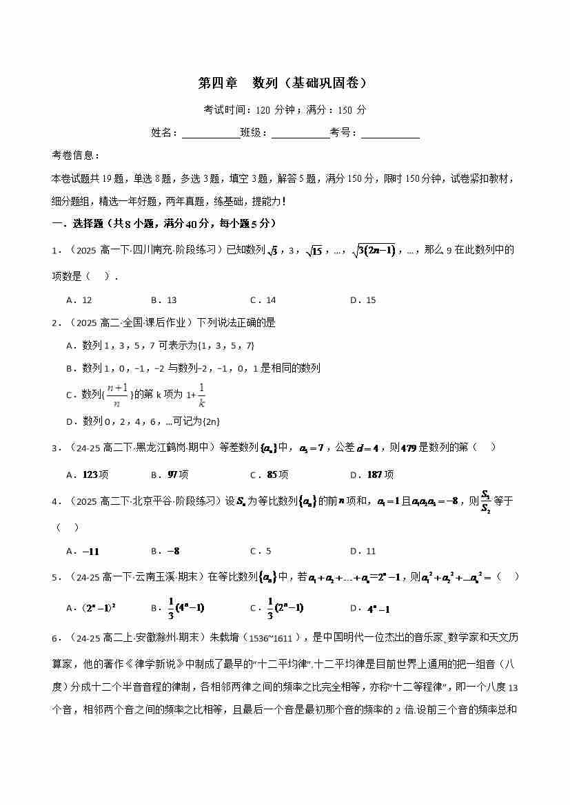 第四章 数列(基础巩固卷)(人教A版2019选择性必修第二册)(学生版)