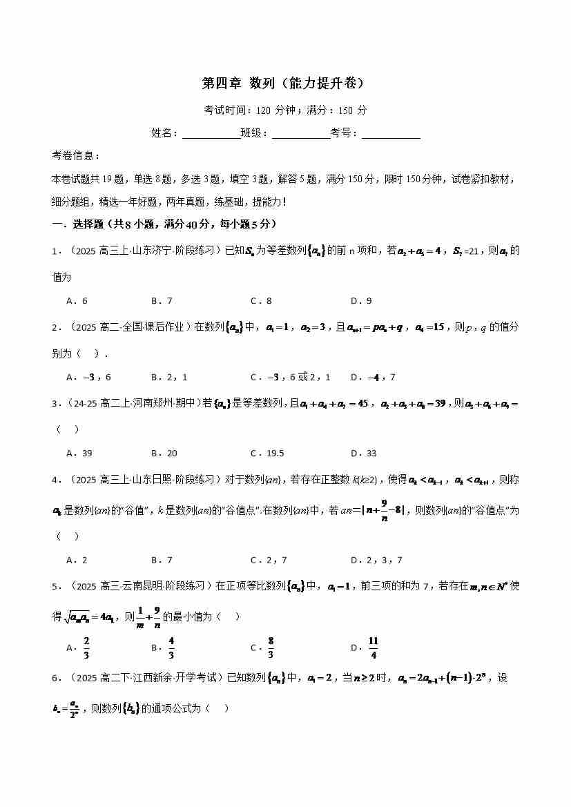 第四章 数列(能力提升卷)(人教A版2019选择性必修第二册)(学生版)