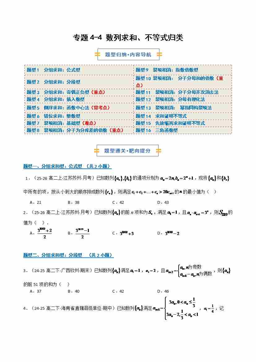 专题4-4 数列求和、不等式归类(期末复习专项训练)(原卷版)