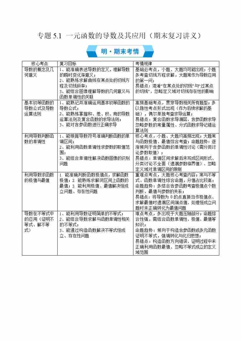 专题5.1 一元函数的导数及其应用(期末复习讲义)原卷版
