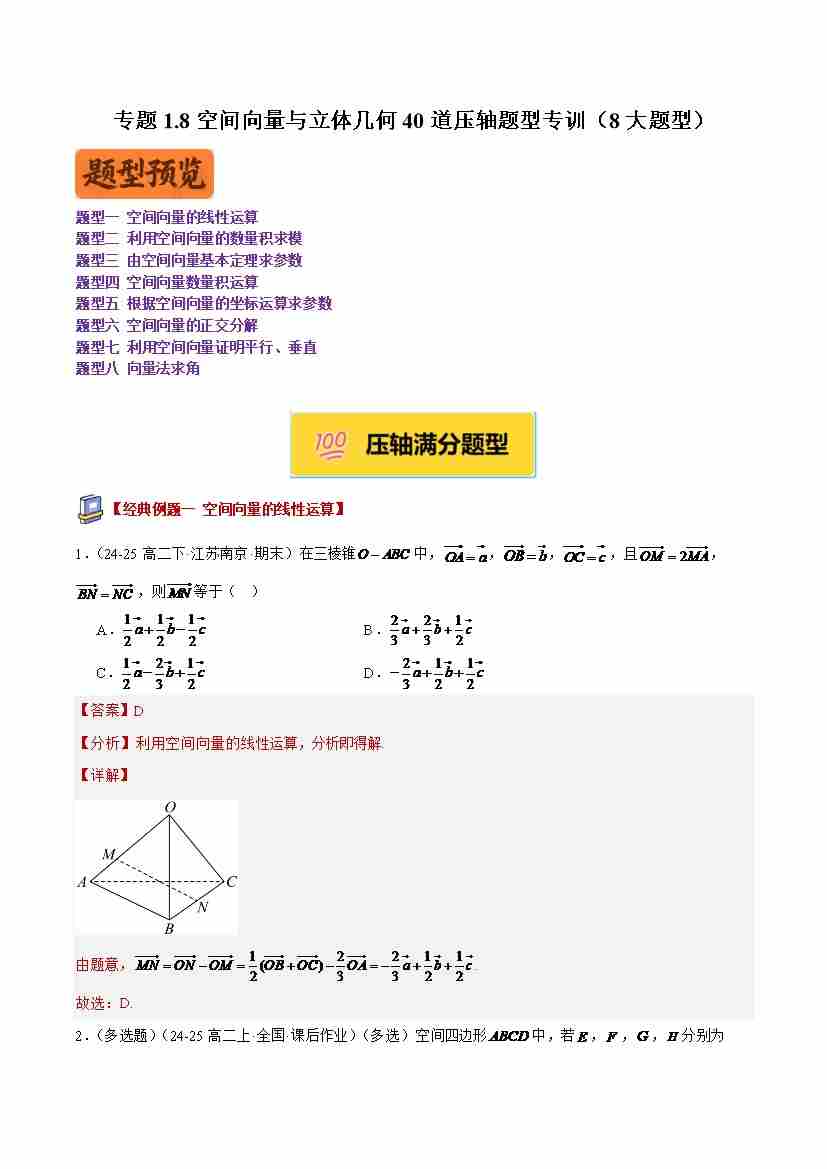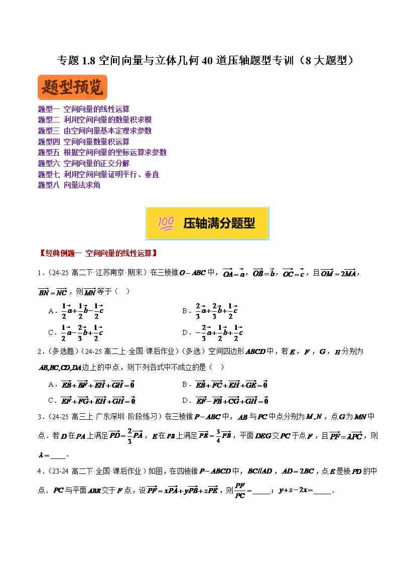 专题1.8空间向量与立体几何40道压轴题型专训(8大题型)(学生版)