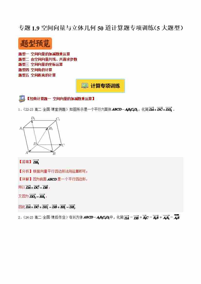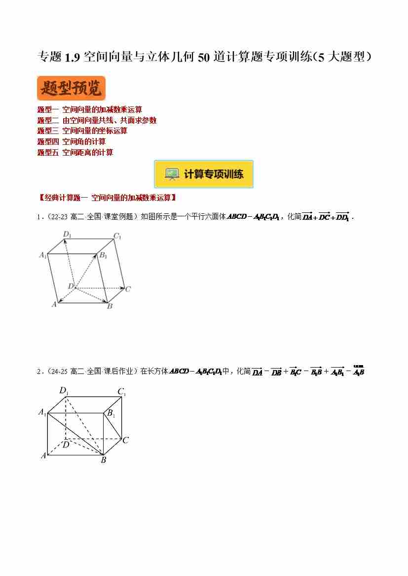 专题1.9空间向量与立体几何50道计算题专项训练(5大题型)(学生版)