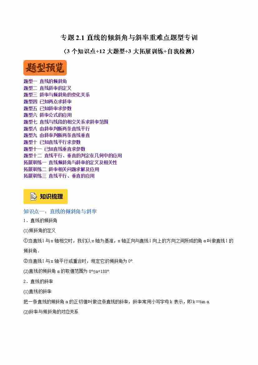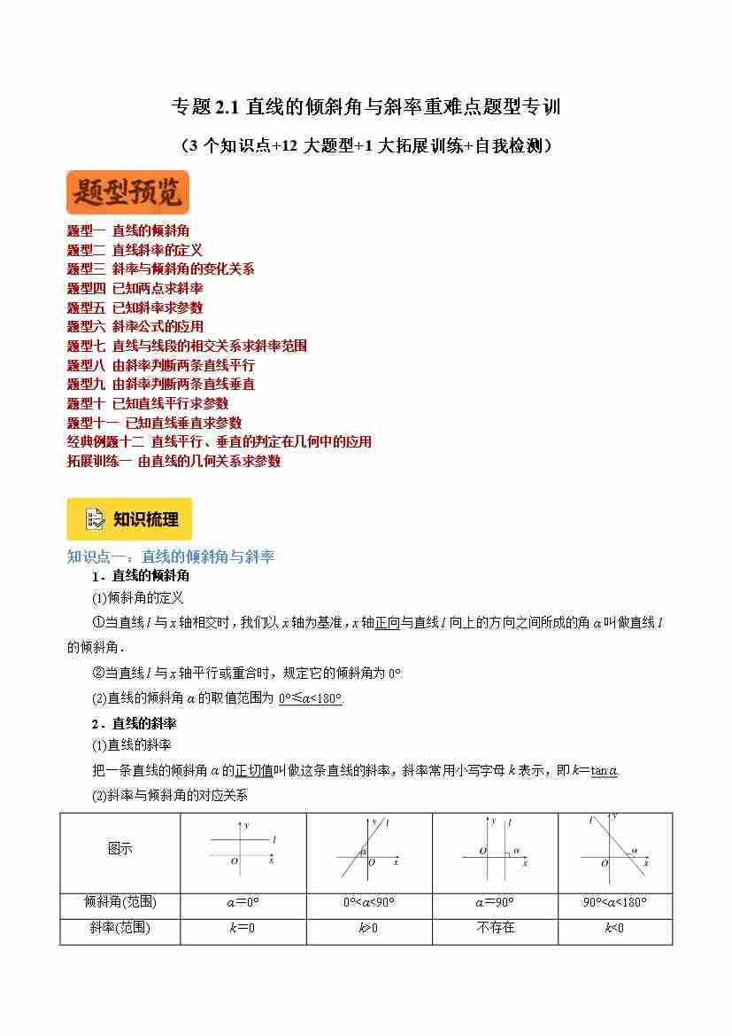 专题2.1直线的倾斜角与斜率重难点题型专训(3个知识点 12大题型 1大拓展训练 自我检测)(教师版)